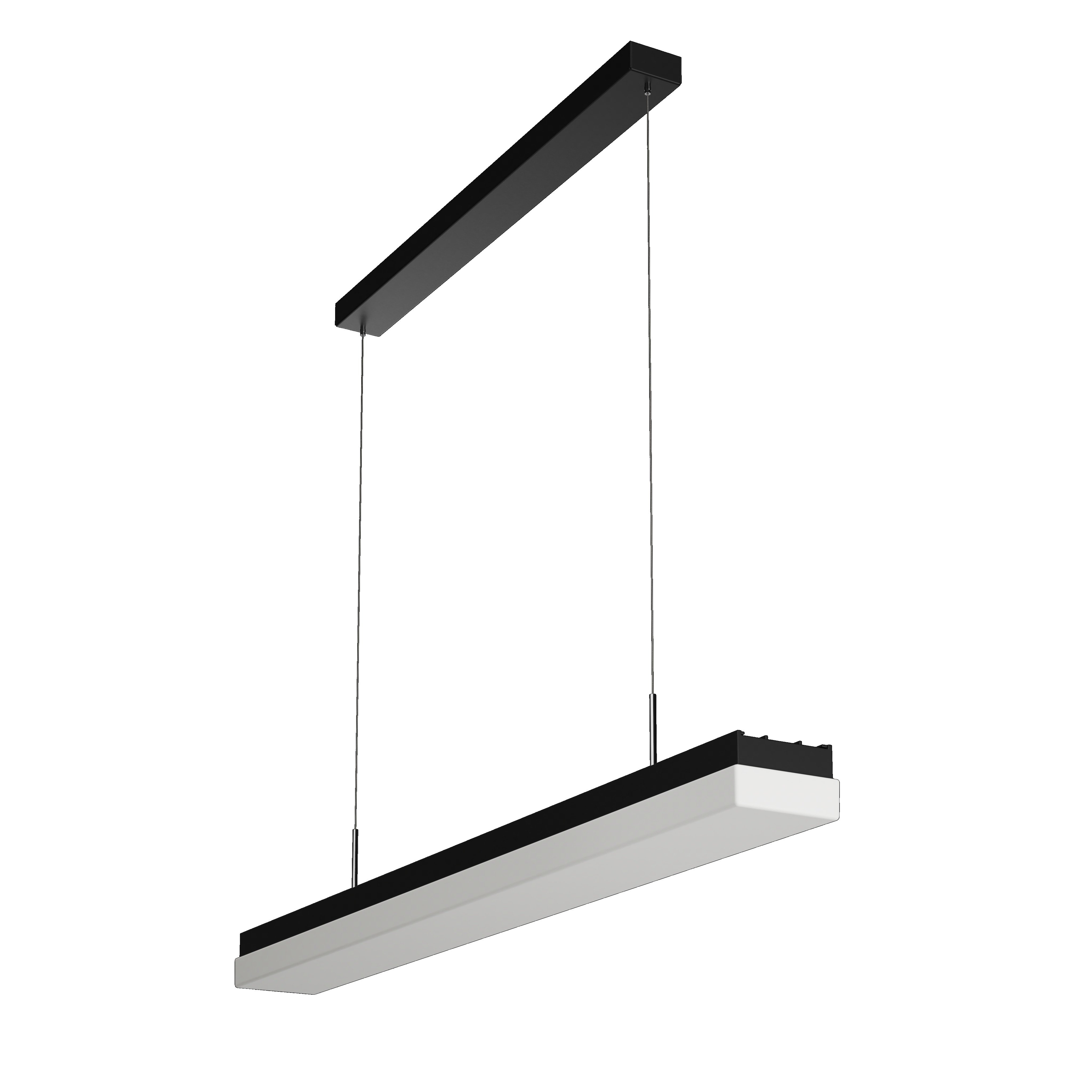 Černé závěsné LED svítidlo ON/OFF s multipower funkcí a polykarbonátové stínidlo. Lankový závěs (SELV, bezkabelový) o délce 100 cm.