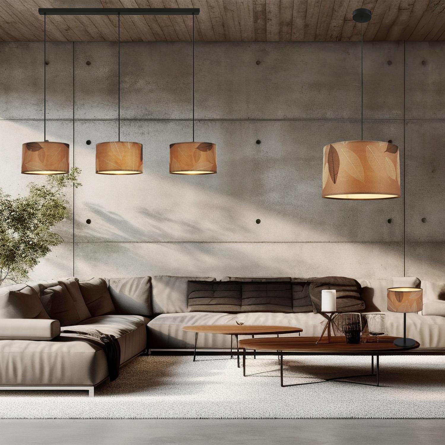 Stínidlo v teplém kávovém odstínu doplňuje decentní černý závěs a montura. Použití kvalitní textilie a kovových prvků podtrhuje luxusní dojem a zároveň zajišťuje dlouhou životnost svítidla. Vřelá barevnost vytváří útulný efekt a opticky zateplí každý prostor.