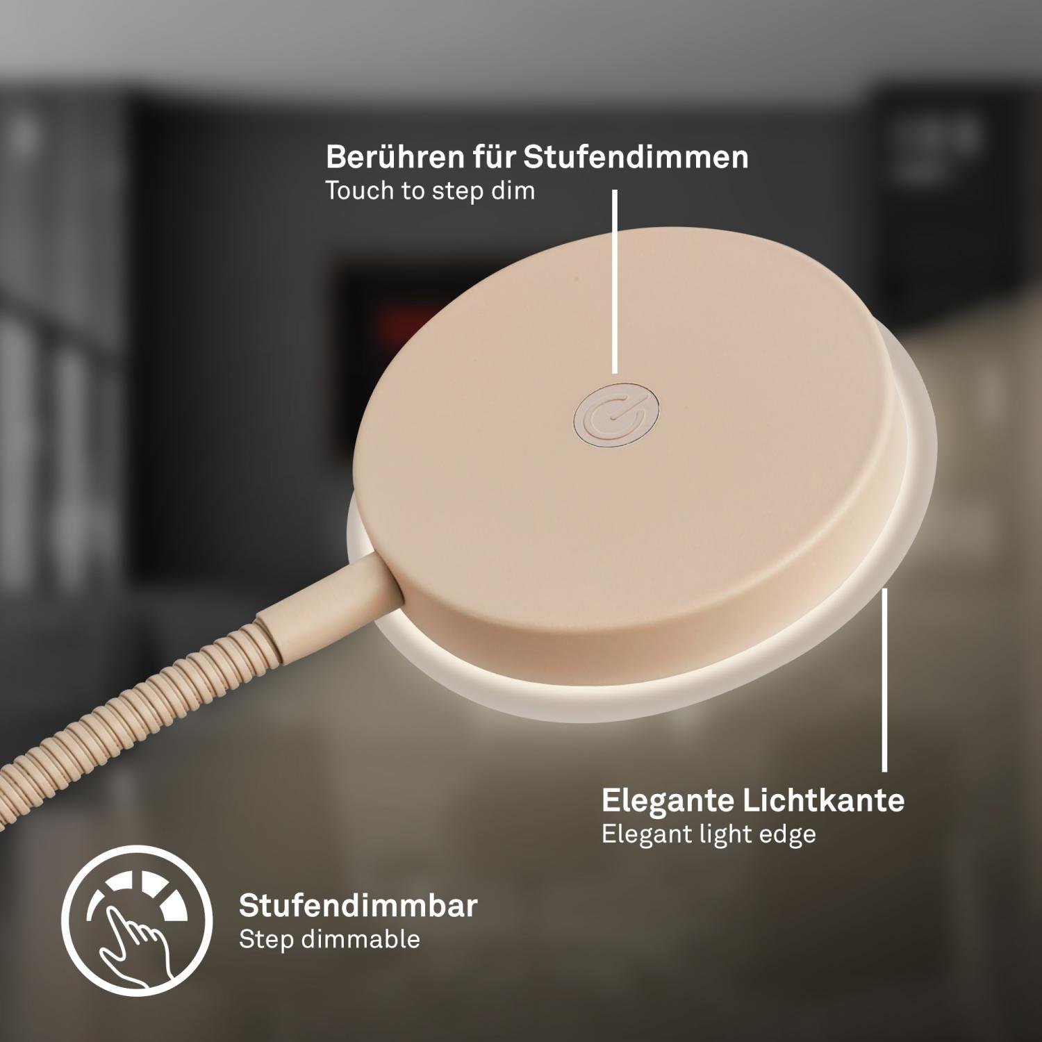 Svítidlo má štíhlý stojan na kruhové základně a flexibilní rameno zakončené plochou hlavou. Kombinace plastu a kovu v béžovém provedení působí vizuálně klidně, takže lampa v interiéru nevytváří výrazný objem a uplatní se tam, kde má zůstat dominantní nábytek nebo materiály.