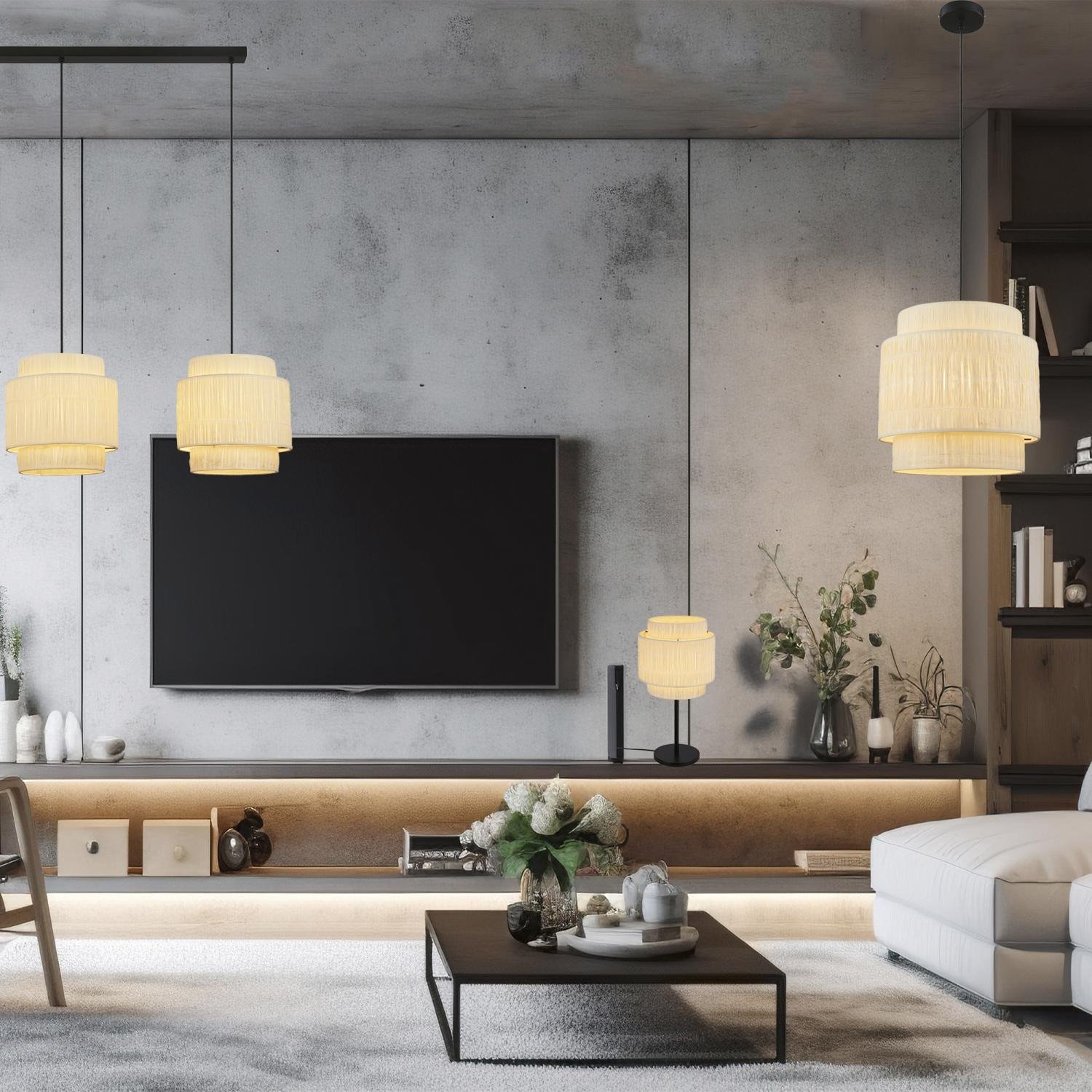 - Moderní boho styl: Kombinace černého kovového závěsu a přírodního stínidla je trendovou volbou do obývacích pokojů, jídelen či nad kuchyňské ostrůvky.
