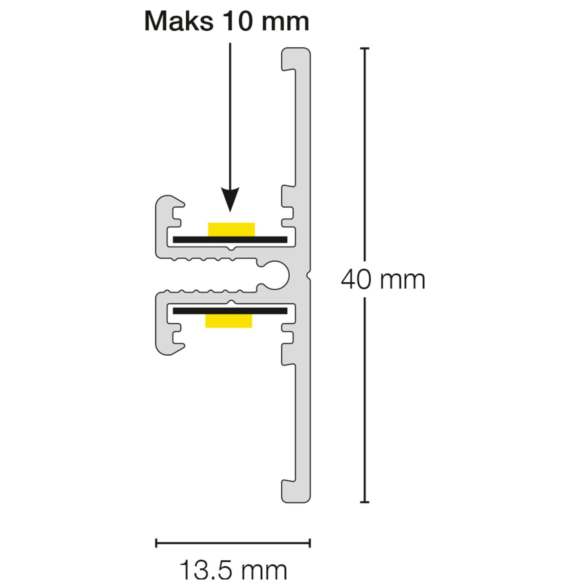 Profil je vyroben z hliníku v bílé povrchové úpravě. Konstrukce s výškou 40 mm a šířkou 13,5 mm je navržena pro instalaci LED pásků s maximální šířkou 11,2 mm. Vnitřní výška prostoru pro pásek je 5 mm. Profil lze připevnit pomocí montážních klipů (objednávají se samostatně) nebo přímo přišroubovat zezadu. Doporučuje se použití krytu LED pásku pro ochranu před prachem a rovnoměrnější rozptyl světla.