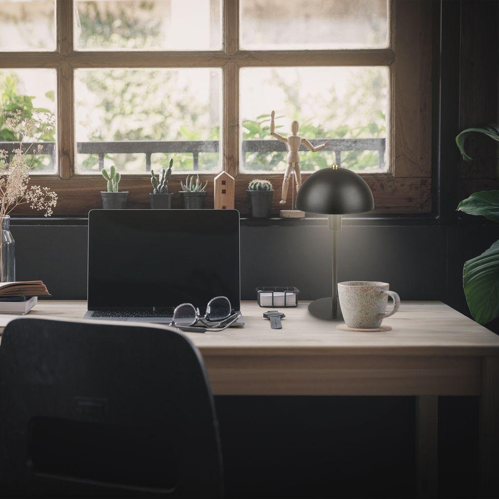 Pura stolní lampička v elegantní černé barvě je perfektním doplňkem každého moderního interiéru. Díky čistému kovovému tělu a ikonickému polokulovému stínidlu působí lampička nadčasově a snadno se začlení do ložnice, pracovny či obývacího pokoje. Vyniká propracovanými detaily, které podtrhnou styl vašeho domova či kanceláře.