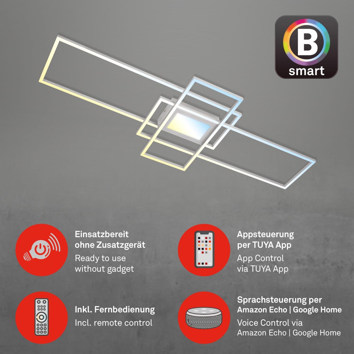 Toto svítidlo je plně kompatibilní s chytrou domácností – můžete jej ovládat hlasem (Google Assistant, Amazon Alexa), prostřednictvím intuitivní mobilní aplikace (Tuya, WiFi, Bluetooth), nebo klasicky dálkovým ovladačem, který je součástí balení. Díky tomu můžete světlo jednoduše zapínat, měnit režimy nebo regulovat intenzitu světla odkudkoli.