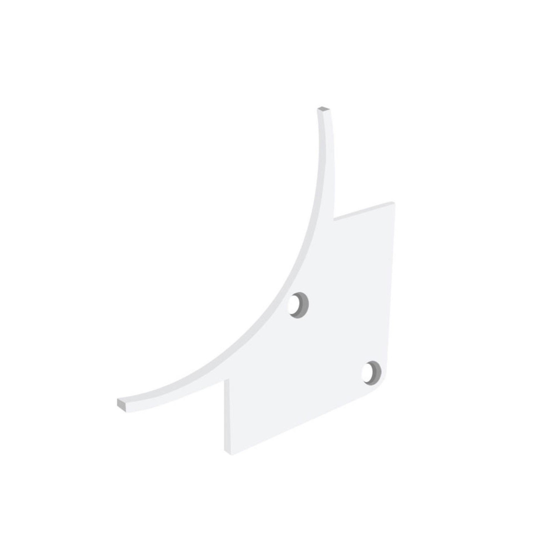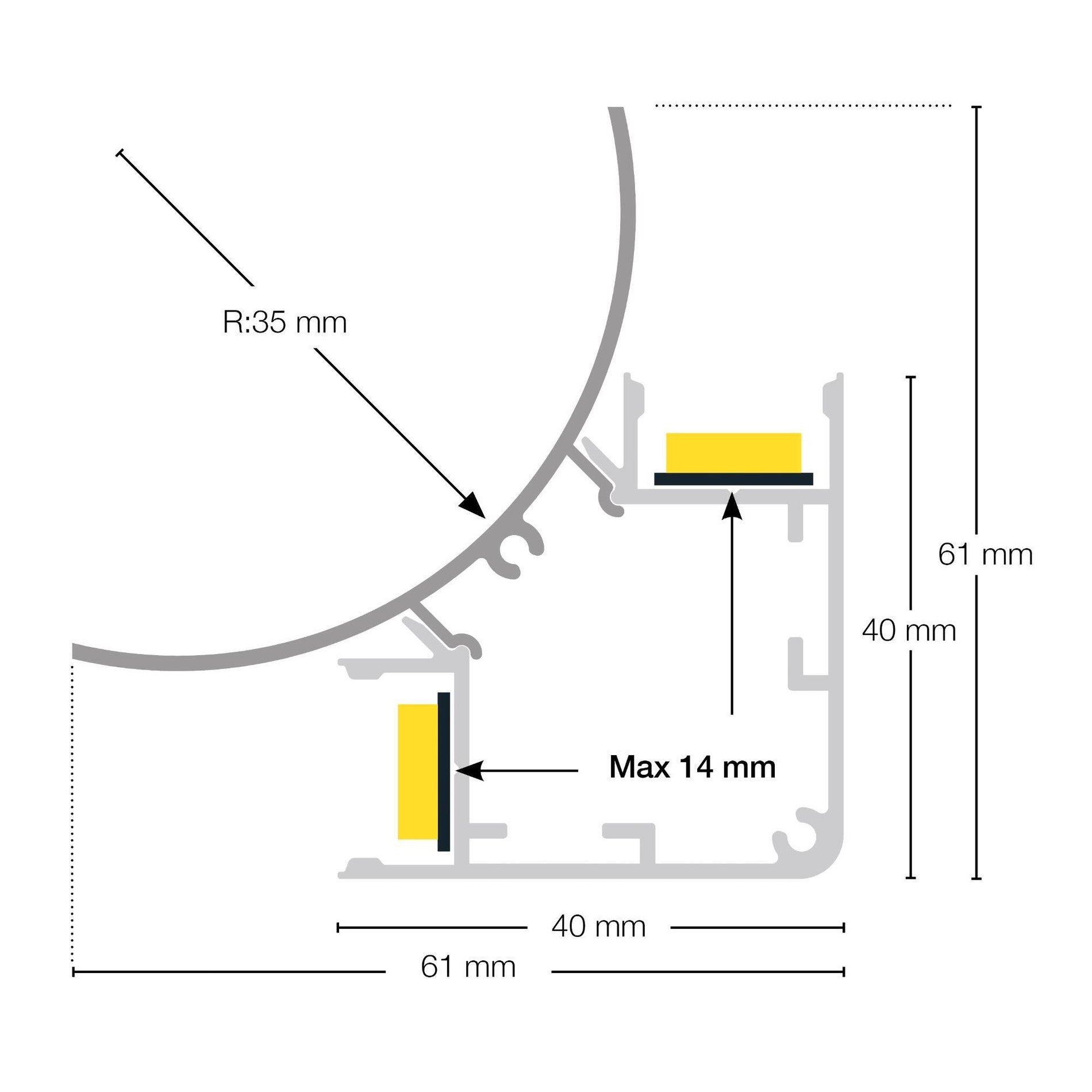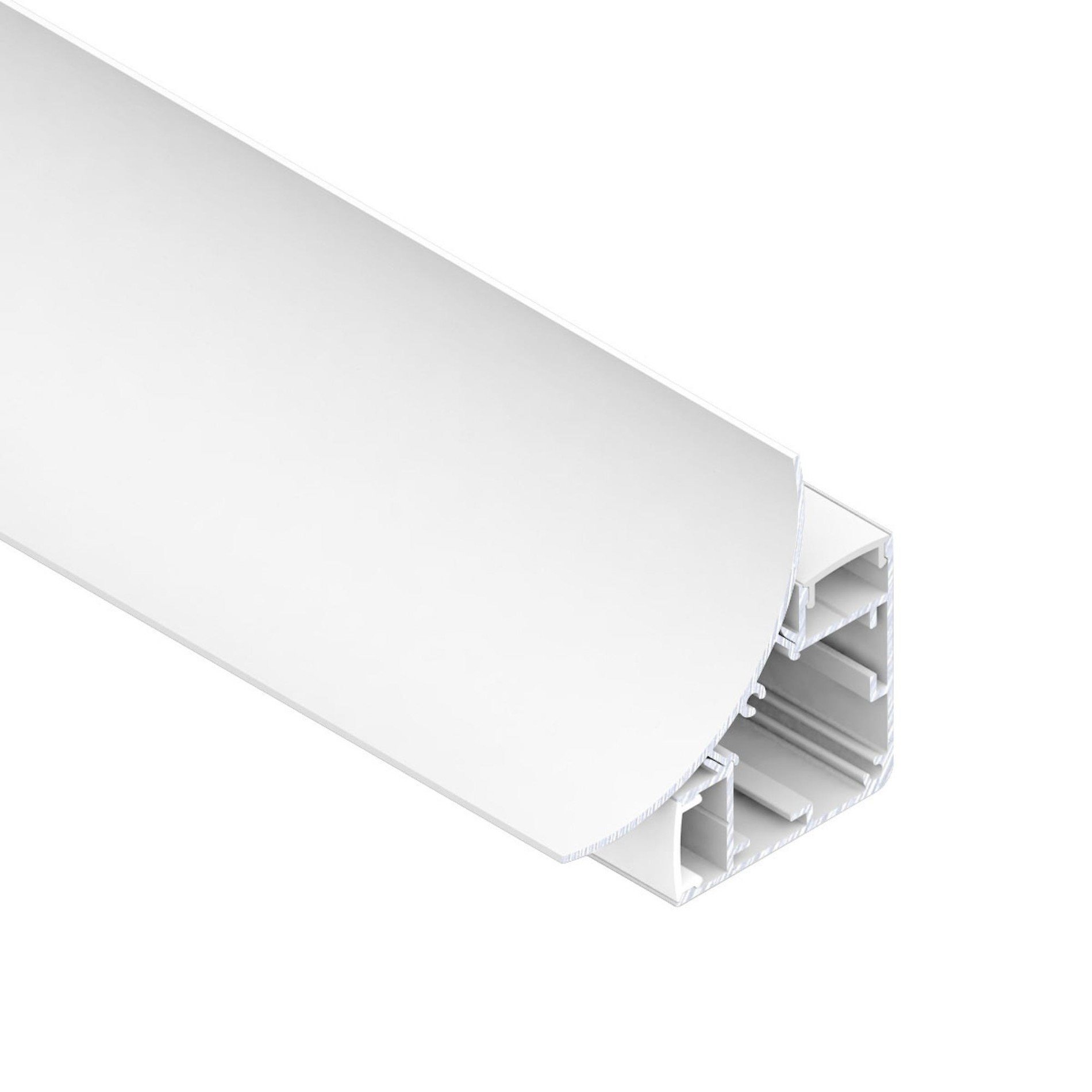 Profil má pravoúhlý tvar s oblou horní hranou, což umožňuje čisté napojení do rohu mezi stěnou a stropem. Je vyroben z hliníku s bílou práškovou povrchovou úpravou, která zajišťuje odolnost vůči UV záření a dlouhodobou barevnou stálost. Součástí sady je kryt a koncovky, což usnadňuje kompletní instalaci a zajišťuje jednotný vzhled.
