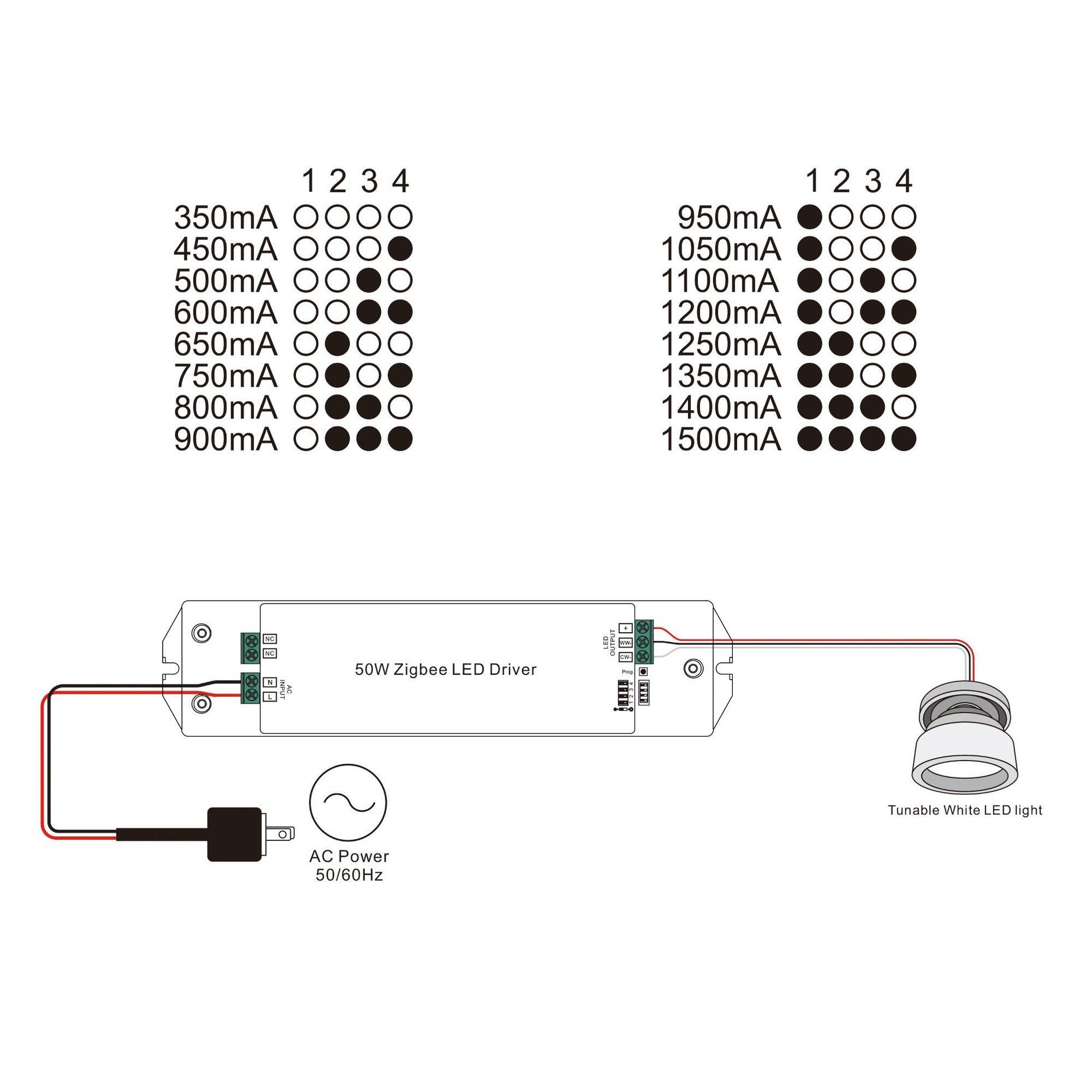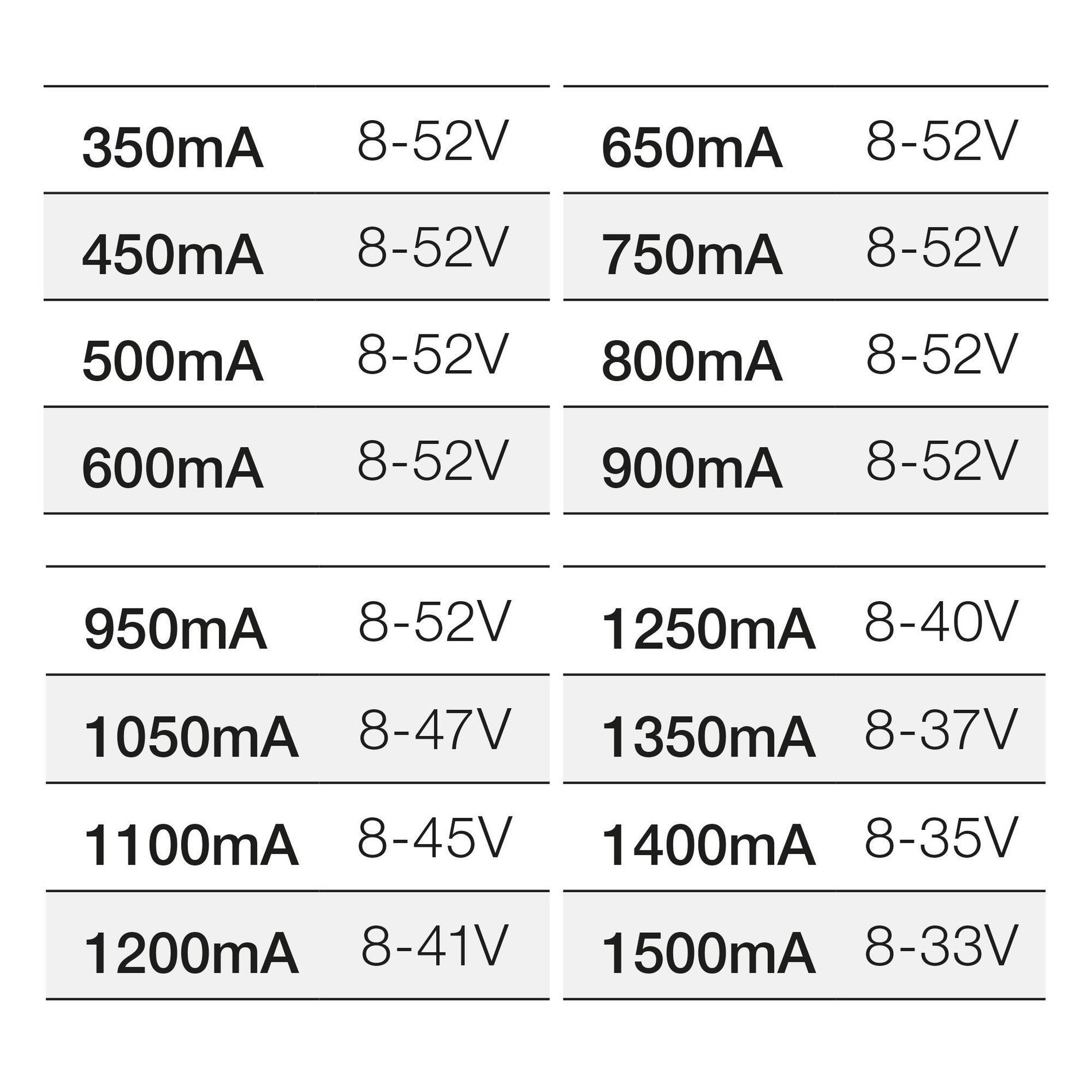 | Proudové zatížení | 350/450/500/600/650/750/800/900/950/1050/1100/1200/1250/1350/140mA |