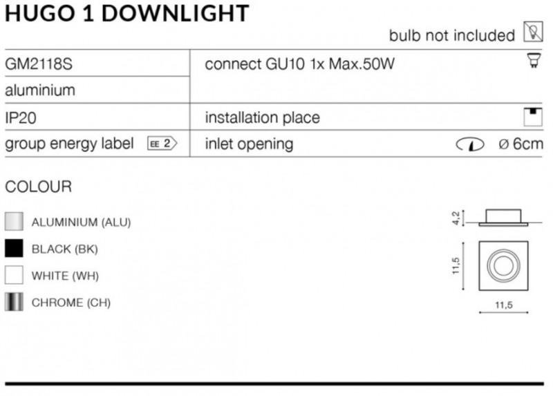 NUTNÉ PŘIKOUPIT VSADKU REMO R! Stropní podhledové svítidlo Hugo 1 Downlight z kolekce Azzardo se svým jednoduchým minimalistickým provedením hodí do moderně zařízených interiérů k nasvícení chodeb, kuchyňských koutů či pracoven. Svítidlo není vhodné pro umístění do koupelen kvůli nižšímu stupni krytí IP20. Rámeček je vyroben z kvalitního hliníku v broušeném provedení, který je nutné doplnit o vsadku REMO R, která je dostupná v několika barevných variantách. Svítidlo je osazeno paticí GU10 o maximálním příkonu 1 x 50 W (zdroj není součástí balení). Pro montáž je potřeba otvor o průměru 6 cm. Výška svítidla činí 4,2 cm a délka jedné strany měří 11,5 cm. Vztahuje se na něj záruka 3 roky.