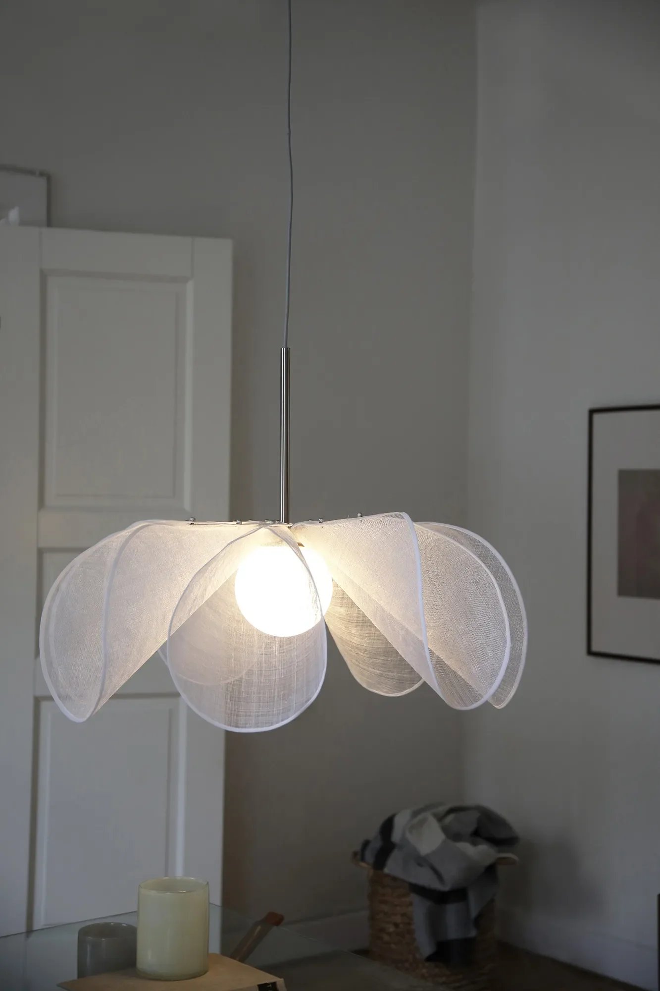 Závěsné svítidlo Markslöjd Styrka v bílé barvě představuje impozantní spojení přírodních materiálů a moderního skandinávského designu. Autorky Anja Pärson a Filippa Rådin vtiskly tomuto svítidlu podobu rozkvetlého květu, jehož okvětní lístky jsou vytvořené z jemného banánového vlákna. Pod nimi se skrývá opálové bílé sklo, které krásně rozptyluje světlo a vytváří příjemnou atmosféru v každém interiéru.