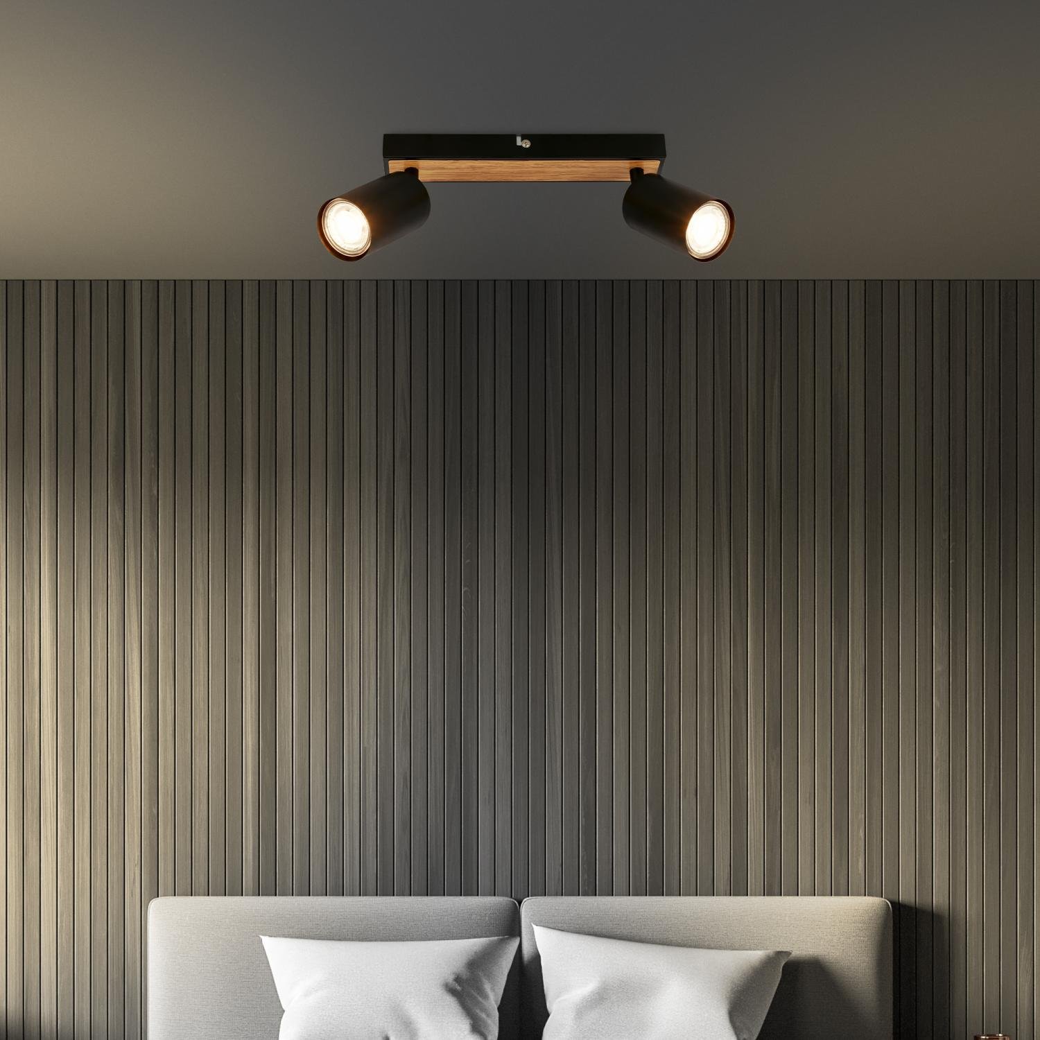 Tib stropní bodové svítidlo, nastavitelné, On/Off nástěnným vypínačem, 2-ramenné, černá / dřevo - BRILO