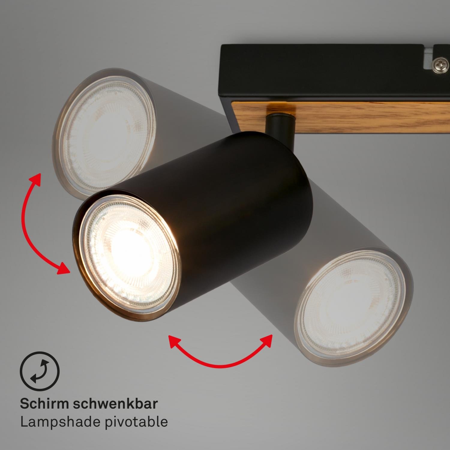 Stropní bodové svítidlo BRILONER Tib v černo-dřevěné kombinaci je stylovým doplňkem pro váš obývací pokoj, kuchyň, jídelnu nebo chodbu. Tři pohyblivá ramena umožňují individuální směrování světla přesně tam, kde potřebujete – ideální pro pracovní kout, jídelní stůl, nebo zvýraznění dekorací na stěně.