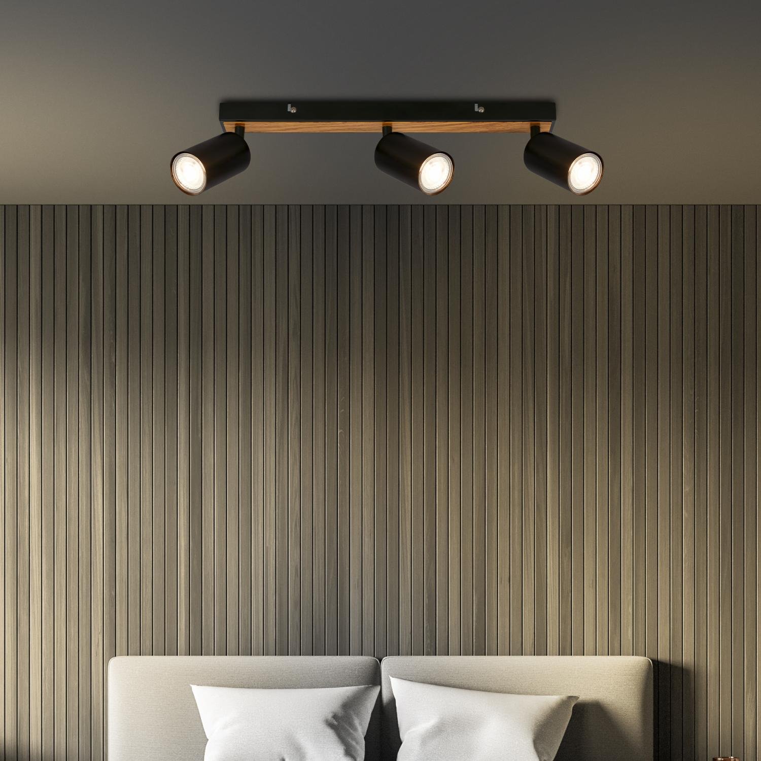 Tib stropní bodové svítidlo, nastavitelné, On/Off nástěnným vypínačem, 3-ramenné, černá / dřevo - BRILO