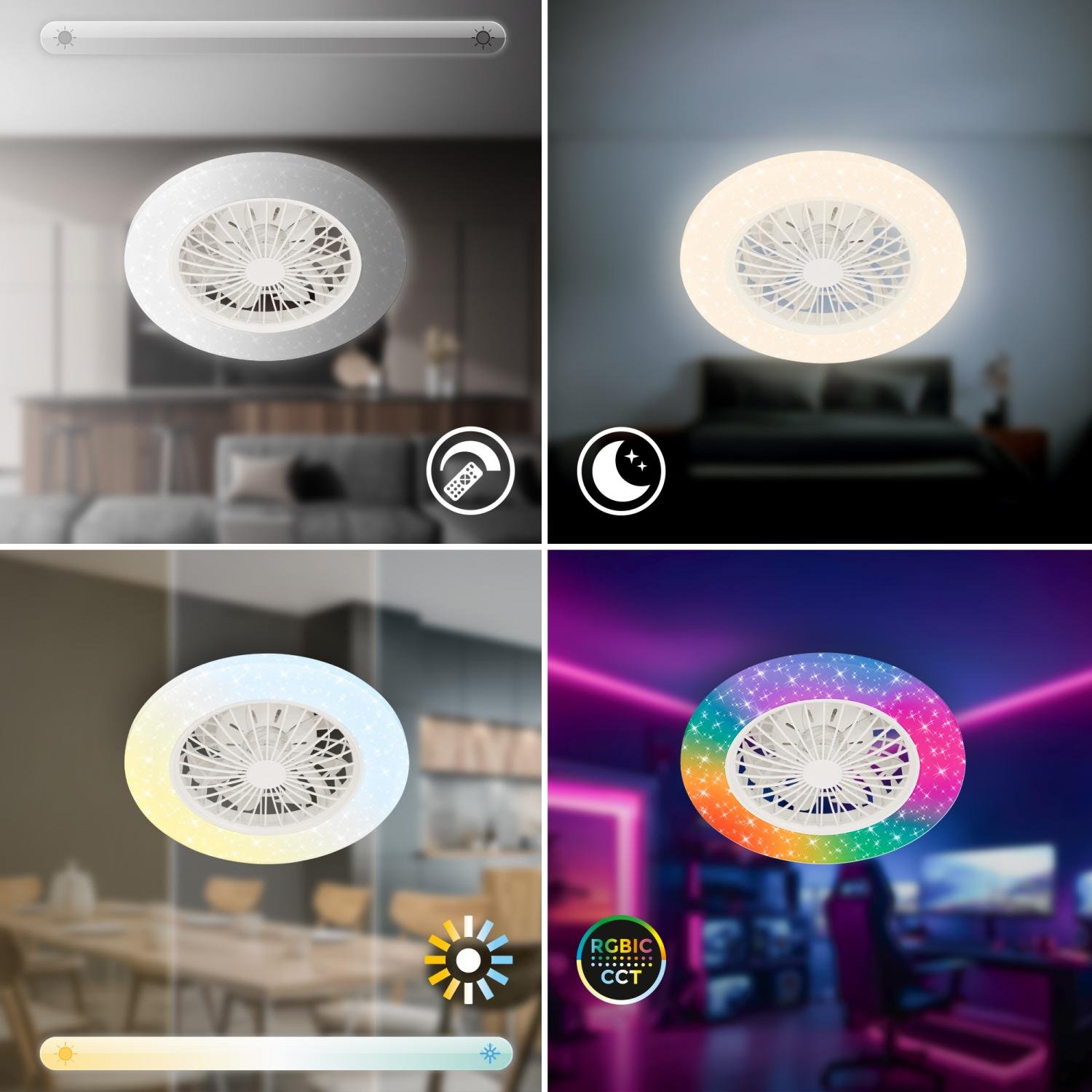 Tuuletin A stropní svítidlo s ventilátorem Ø48,5 cm – 48W, 5300 lm, LED, stmívatelné, dálkový ovladač, CCT, RGBIC, bílé – BRILO