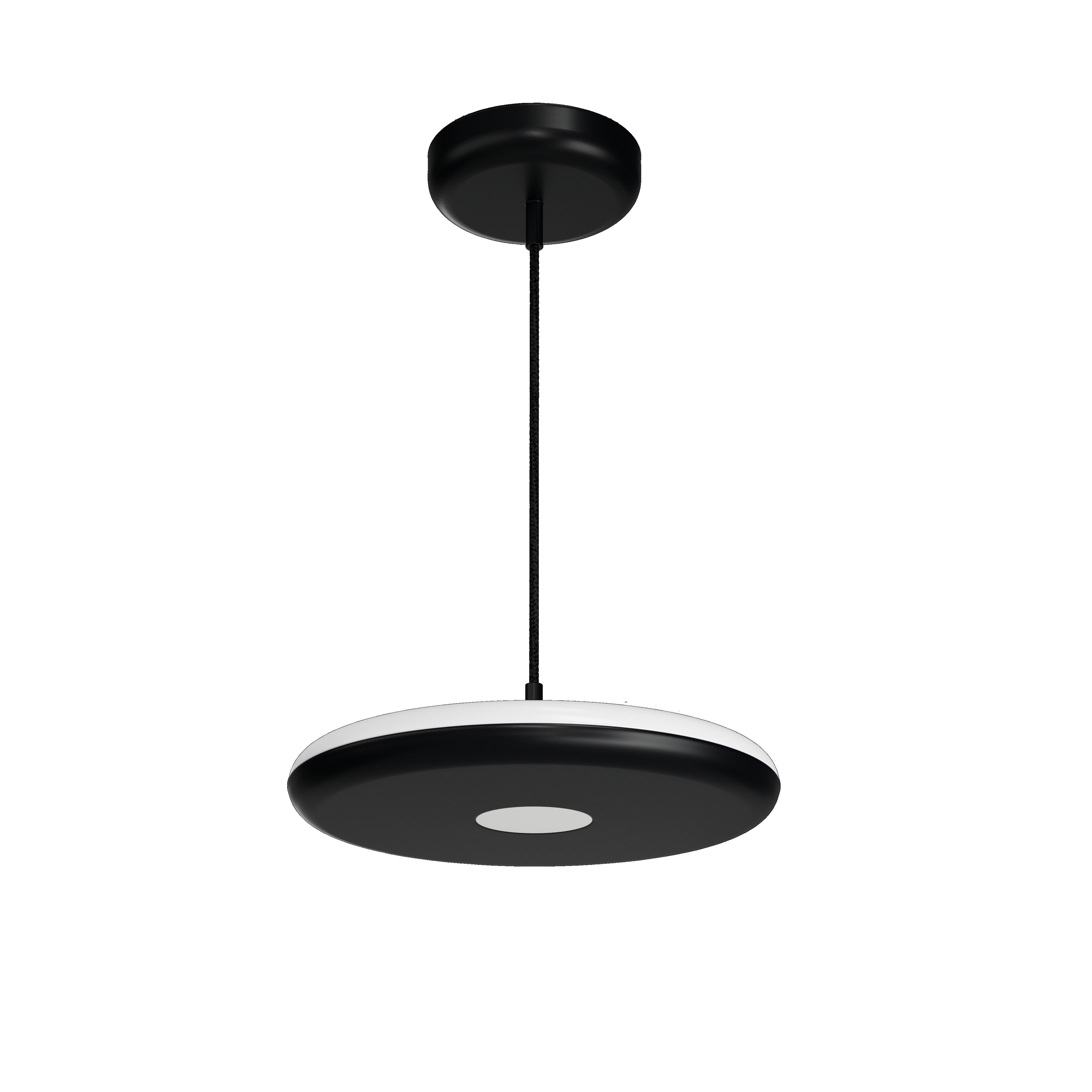 Černé závěsné LED svítidlo ON/OFF s nepřímým svícením a matovaným PMMA stínidlem. Textilní kabelový závěs s vnitřním nosným lankem o délce 100 cm.