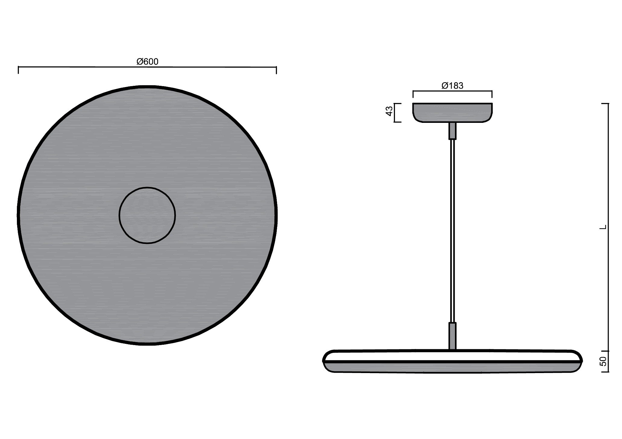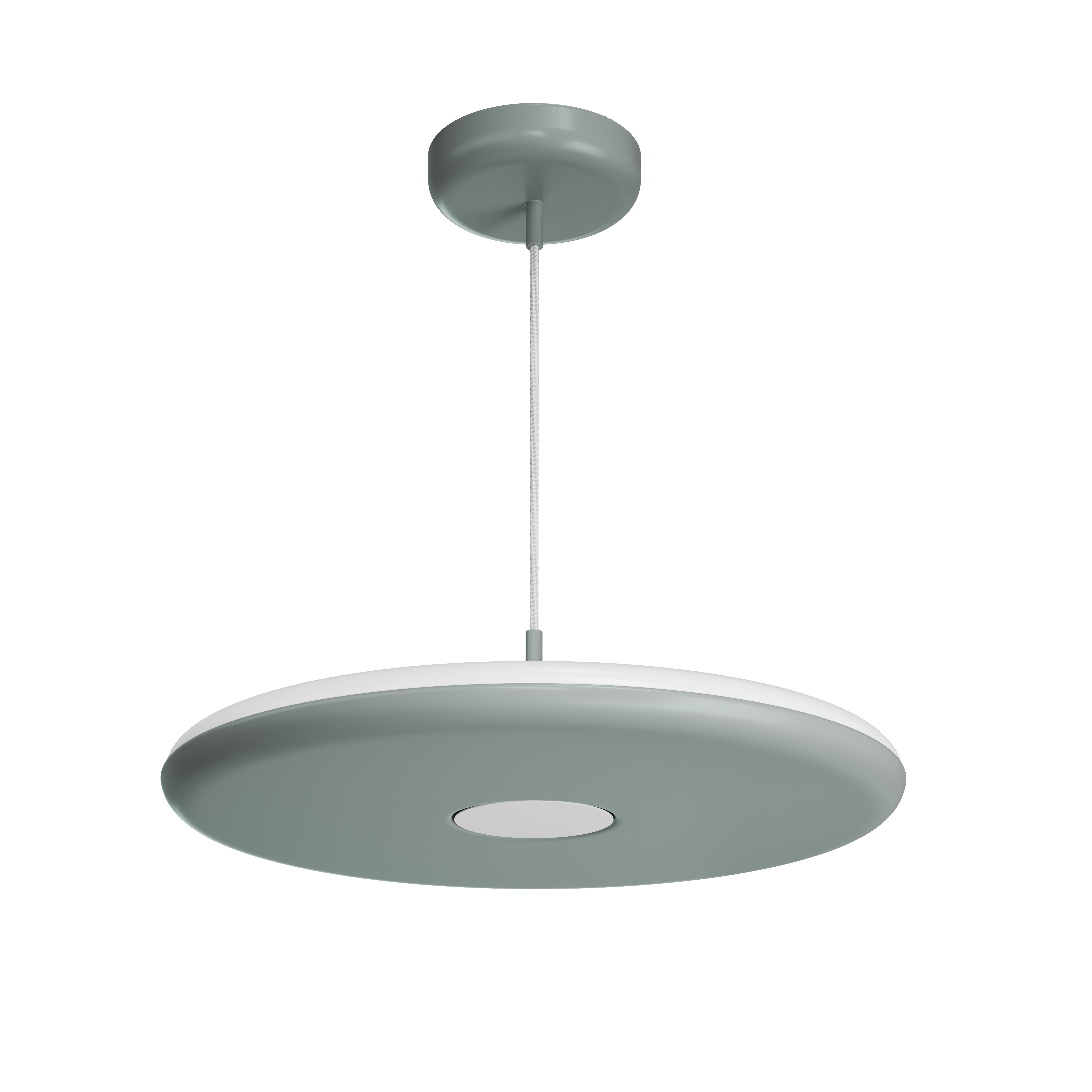 Šedé závěsné LED svítidlo ON/OFF s nepřímým svícením a matovaným PMMA stínidlem. Textilní kabelový závěs s vnitřním nosným lankem o délce 100 cm.
