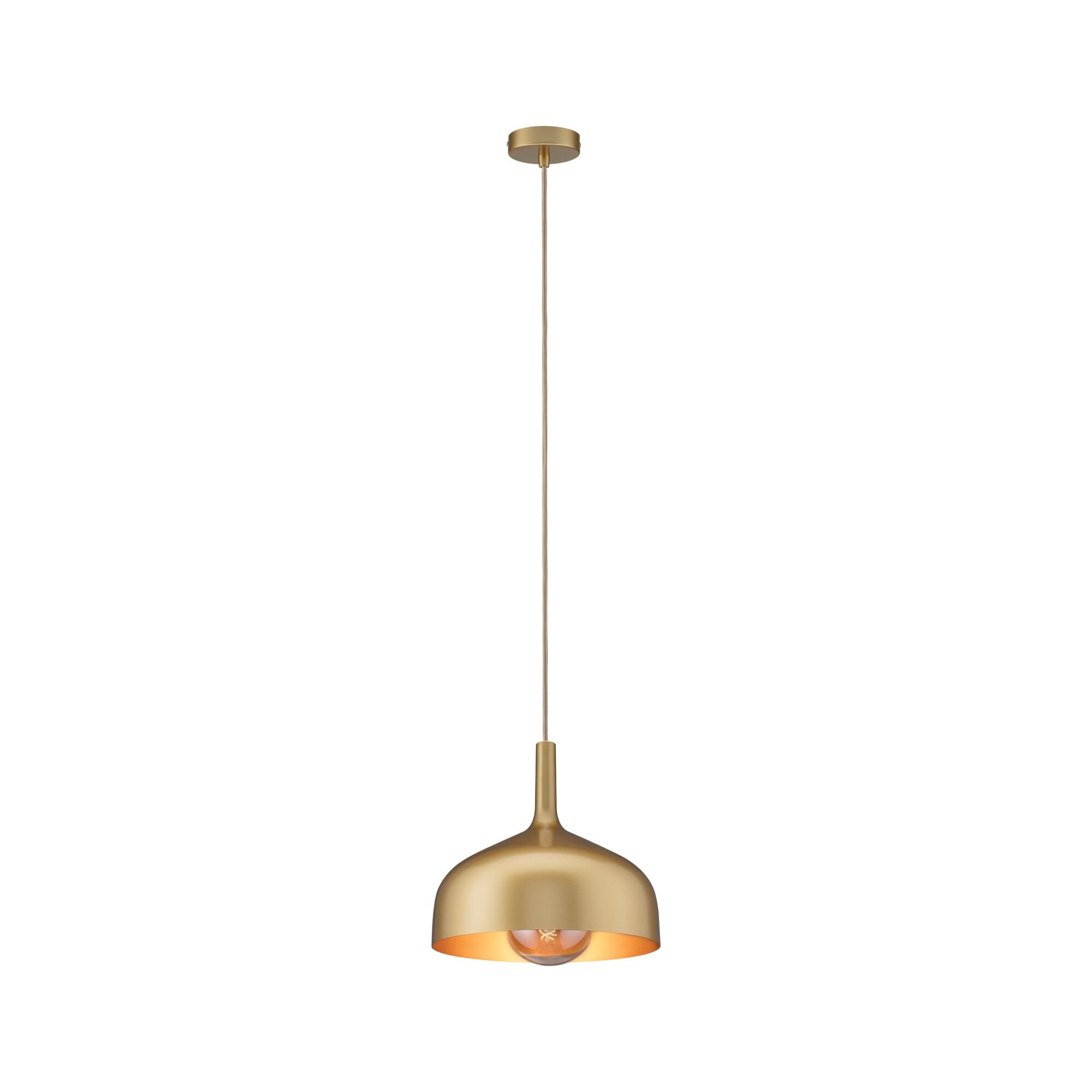 Svítidlo má čistě tvarovaný, kulatý kovový stínidlo v matné zlaté barvě. Povrchová úprava působí elegantně a decentně, což umožňuje začlenění do různých typů interiérů - od rezidenčních po komerční. Textilní kabel je barevně sladěn s tělem svítidla a podtrhuje celkový dojem kvalitního zpracování. Výška závěsu je nastavitelná do 1100 mm, což umožňuje přizpůsobení konkrétní situaci v prostoru.