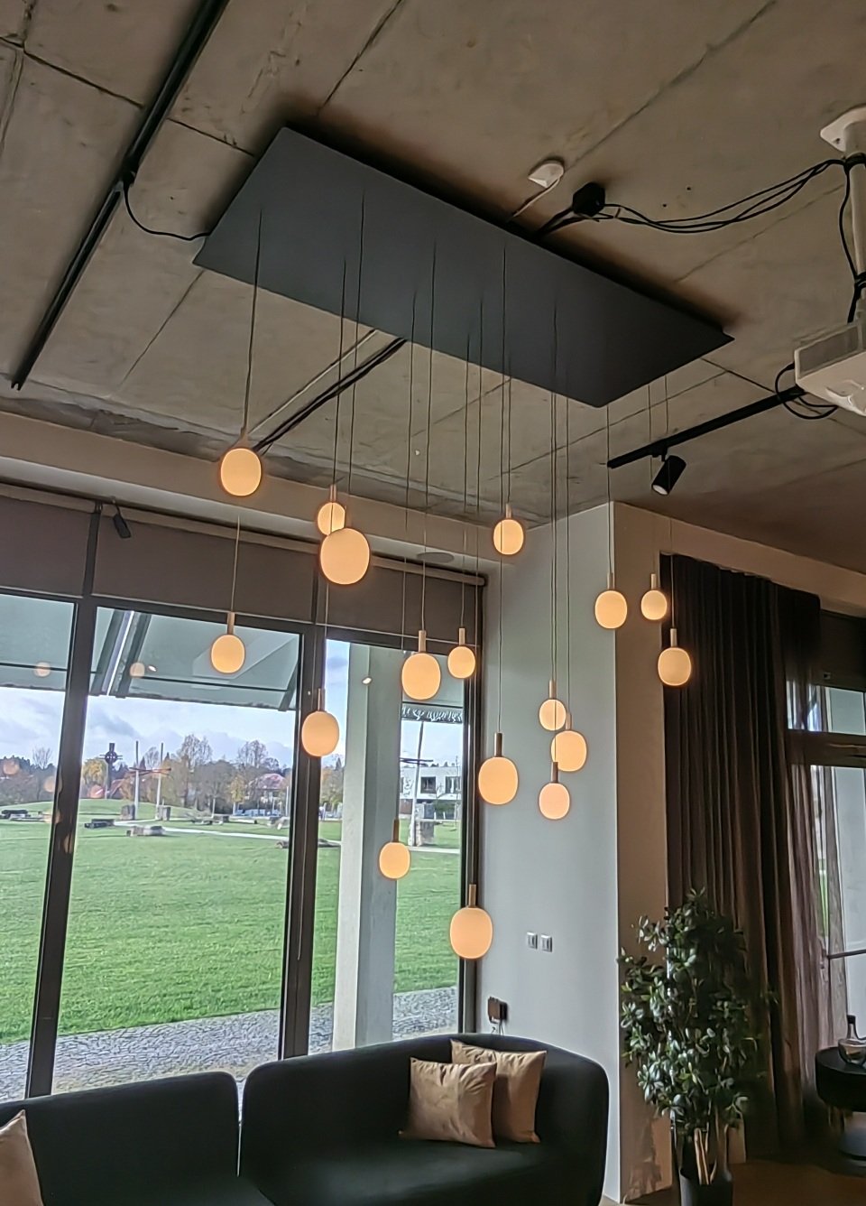 Barva skla: triplex opál, Povrchová úprava skla: matovaný oboustranný povrch skloviny, Povrch montury: kov - bílý matný komaxit, Barva el. vedení: koaxiální kabel - stříbrný. Na studiu Casamoderna je vystaveno 7ks "S", 7ks "M" a 3ks "L" na baldachýnu CP19444. V poznámce v objednávce upřesněte, jaký typ skla a kovových částí chcete objednat.
