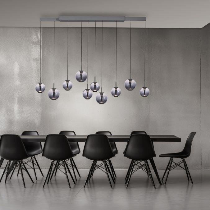 Závěsné svítidlo PURE E-Infinity od renomované značky PAUL NEUHAUS představuje špičku v oblasti designového osvětlení. Stylová kombinace mystické šedé a kvalitních kouřových skel vytváří působivý vizuální efekt, který podtrhuje moderní estetiku jakéhokoliv interiéru. Svítidlo je ideálním řešením pro prostorné jídelny, kuchyňské ostrůvky či reprezentativní obývací zóny, kde se stává nepřehlédnutelným prvkem a zároveň poskytuje dokonale příjemné světlo.
