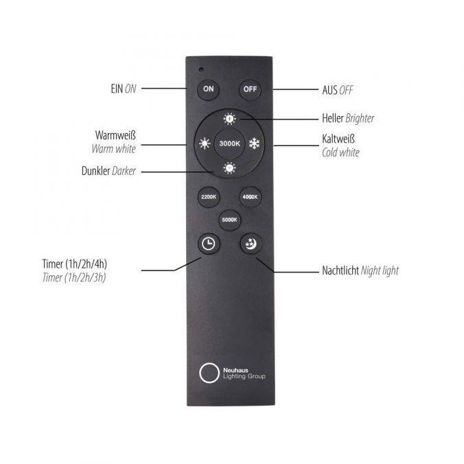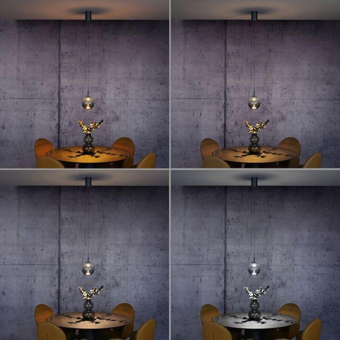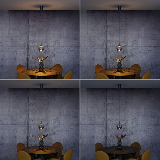 Světlo je rovnoměrně rozptýlené skrze kouřové sklo, což přispívá k příjemné atmosféře v interiéru. Díky možnosti plynulé regulace teploty chromatičnosti v rozmezí 2200–5000 K lze volit mezi teplým bílým a studenějším denním světlem. Stmívání a změna barvy světla probíhá prostřednictvím dálkového ovladače, což umožňuje snadné přizpůsobení světelných podmínek různým situacím – od intimního večerního posezení po pracovní nasvícení. Svítidlo nabízí také noční režim a časovač pro automatické vypnutí. Vysoký index podání barev (CRI ≥ 90) zajišťuje věrné a přirozené zobrazení barev v prostoru.