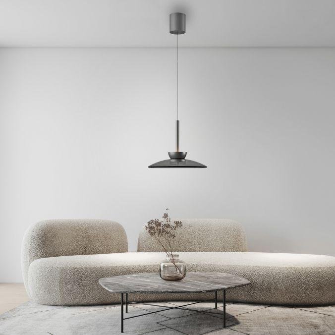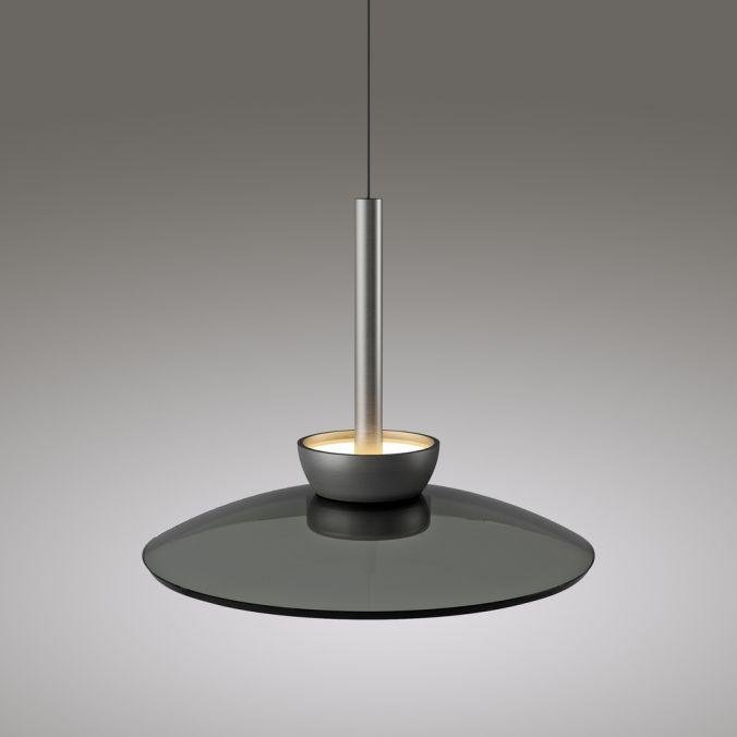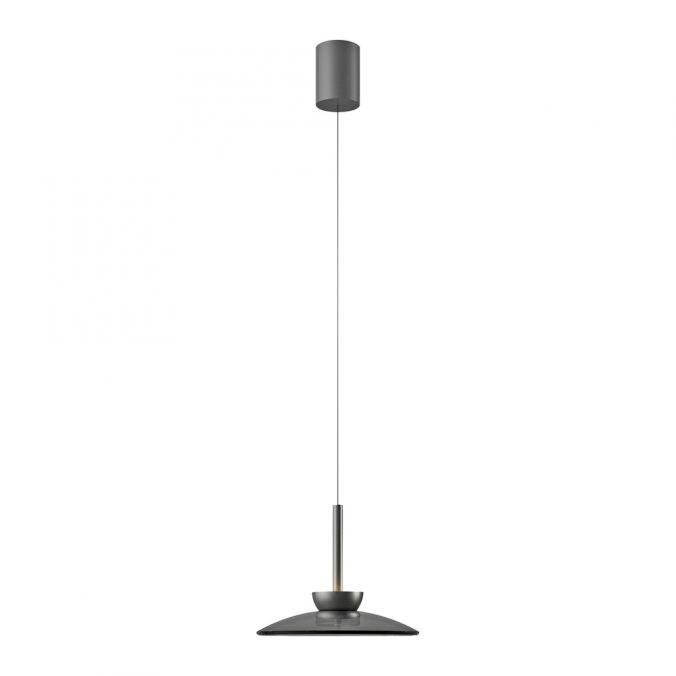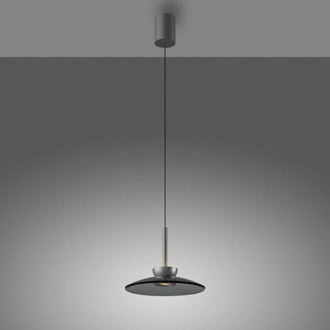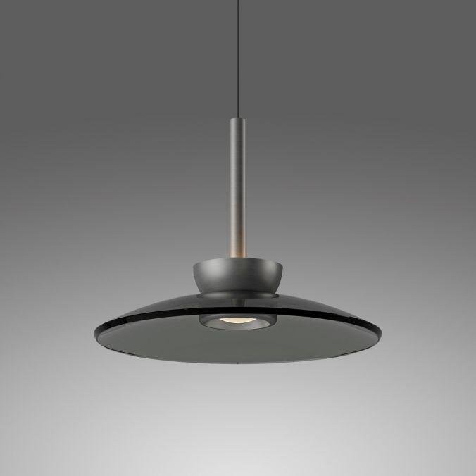 Tělo svítidla je vyrobeno z hliníku v šedé barvě, doplněné o kvalitní kouřové sklo. Minimalistický tvar s výrazným stínidlem o průměru 320 mm podtrhuje moderní charakter svítidla. Výškově nastavitelný závěs umožňuje flexibilní instalaci v různých typech interiérů.