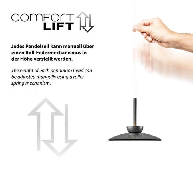 Závěsné svítidlo PURE Moon představuje elegantní řešení pro osvětlení obytných prostor, kde je kladen důraz na kvalitní světlo a variabilitu umístění. Svítidlo poskytuje příjemné teplé bílé světlo s teplotou chromatičnosti 2700 K, které je vhodné pro vytvoření komfortní atmosféry nad jídelním stolem, v obývacím pokoji nebo v kuchyni. Hlavní roli zde hraje možnost přesné výškové regulace díky systému Comfort Lift, což umožňuje přizpůsobení svítidla konkrétním požadavkům prostoru i situace.Kód / označení výrobce: Závěsné svítidlo PURE Moon šedá nastavitelná výška, 2700K - PAUL NEUHAUS