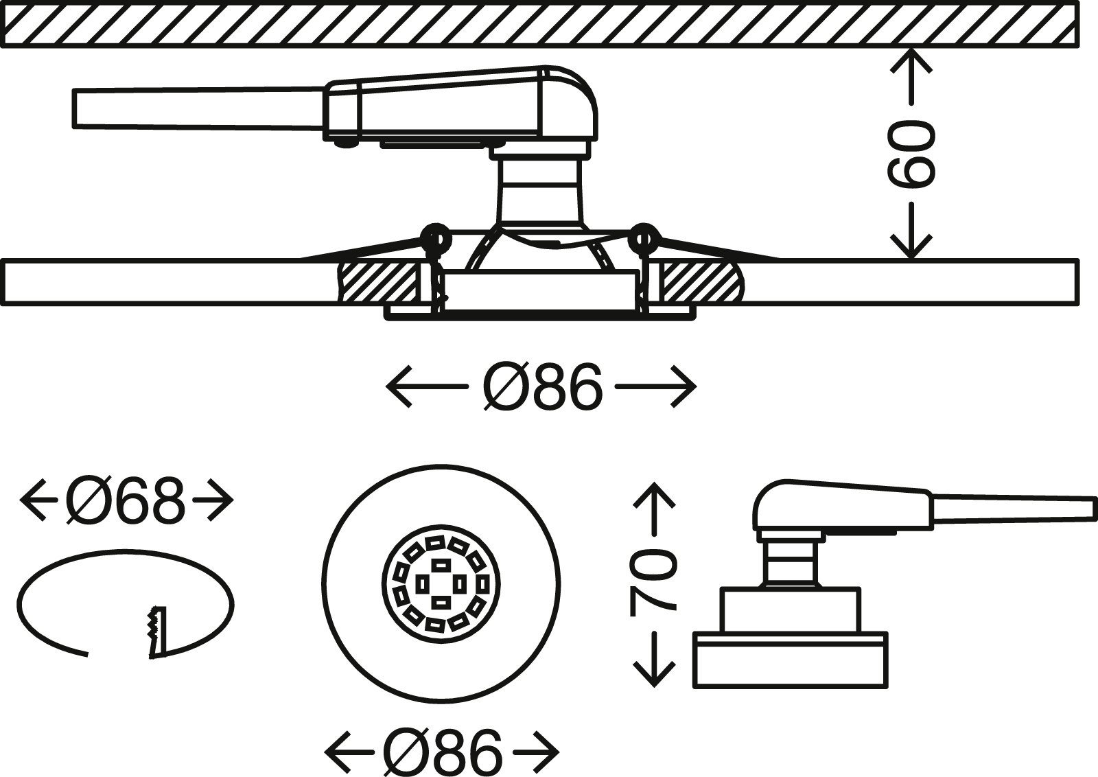 - Jednoduchá instalace: Průměr svítidla 8,6 cm, montážní otvor 6,8 cm, zápustná hloubka 6 cm.