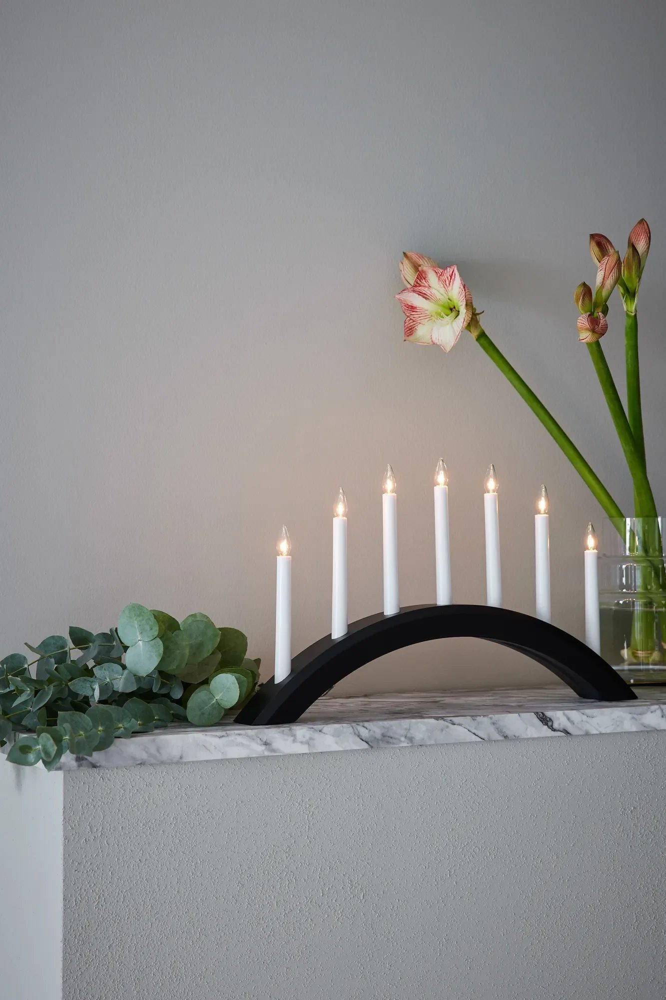 Elegantní a nadčasový černý vánoční svícen Avento od renomované značky Markslöjd je ideálním doplňkem pro stylové slavnostní dekorace i moderní domácnosti. Minimalistický obloukový tvar, kvalitní provedení z MDF a sedm světelných zdrojů v teplé bílé barvě vytváří příjemnou atmosféru a stane se středobodem vašeho vánočního aranžmá.