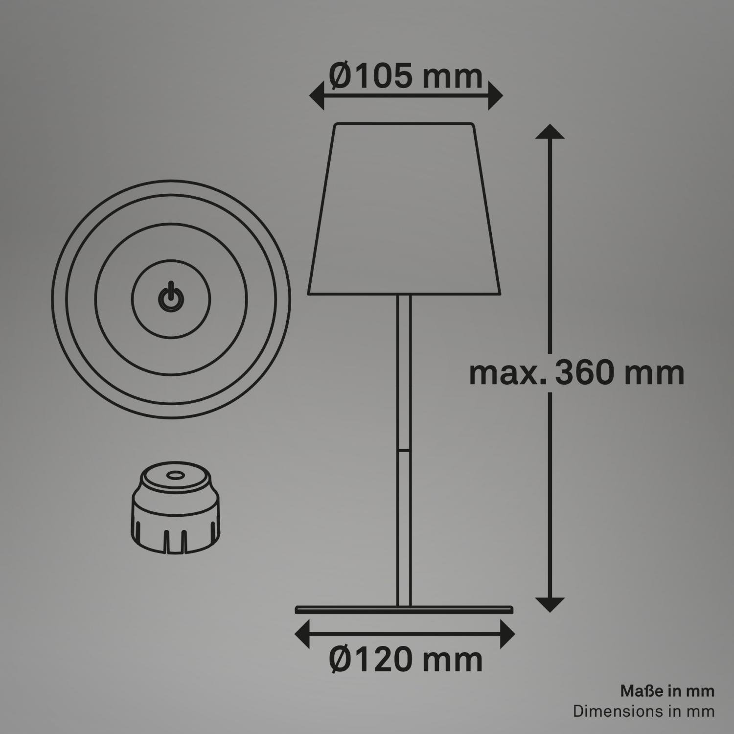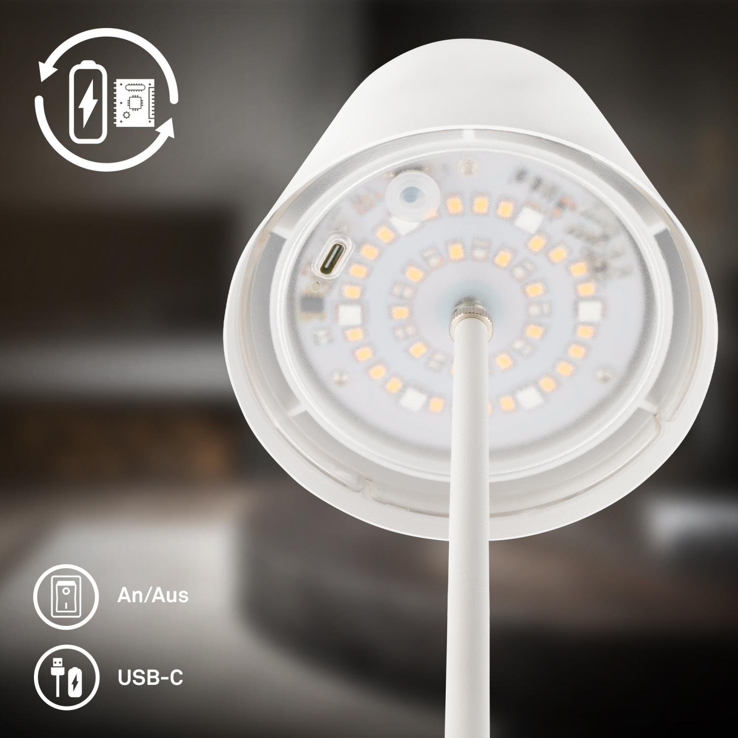 S krytím IP44 je lampa chráněna proti stříkající vodě a je tak vhodná i pro použití na balkóně, terase nebo zahradě. K lampičce je dodáván 0,5m USB-C nabíjecí kabel.