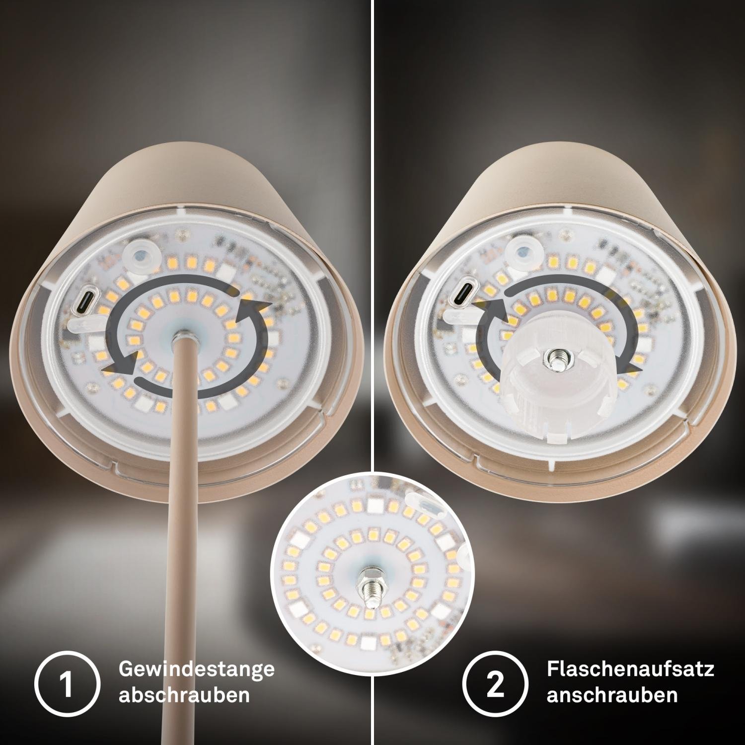 Stolní lampička BRILONER Calida 3 v 1 představuje inovativní řešení pro vaše domácí i venkovní osvětlení. Díky bezdrátovému provozu, flexibilnímu nastavení výšky a možnosti použití na láhev nabízí maximální variabilitu pro každou příležitost – od útulného večera na terase po stylové osvětlení jídelního stolu.