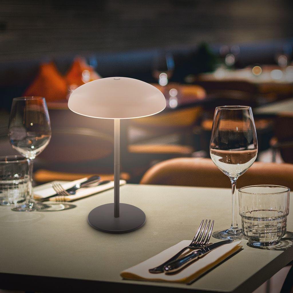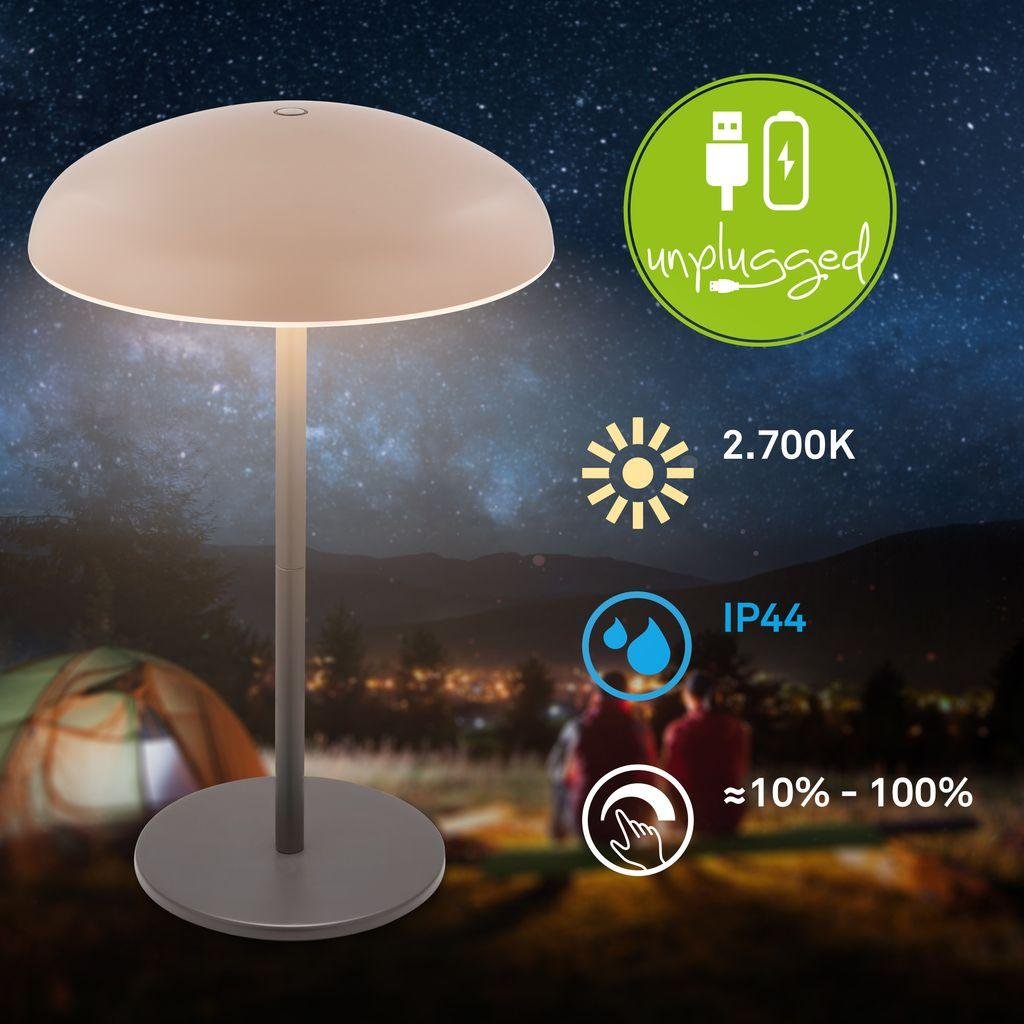 BRILONER Caxa je stylová LED stolní lampa s příkonem 2,8 W a světelným tokem 300 lm, která se skvěle uplatní jak v interiéru, tak na venkovní terase či zahradě. Její ikonický design inspirovaný tvarem houby (pilzoptik) v kombinaci s odstíny béžové a antracitu dodá prostoru nadčasovou estetiku. Díky akumulátorovému provozu a kompaktním rozměrům (Ø19,5 × 30,5 cm) ji můžete snadno přenášet podle potřeby.