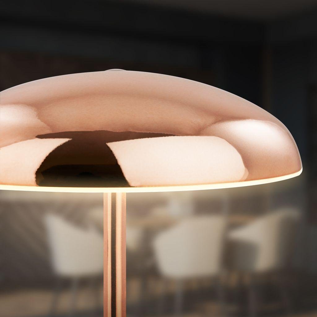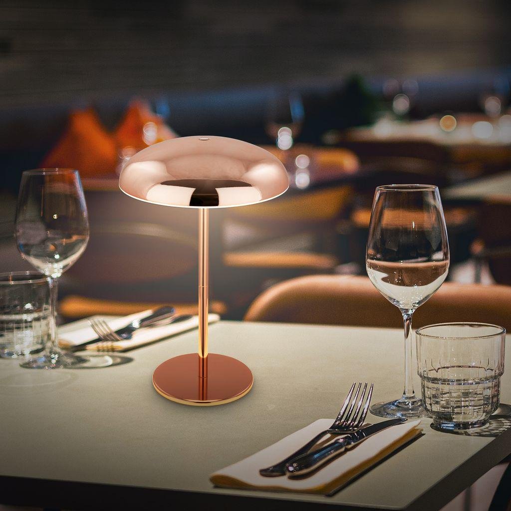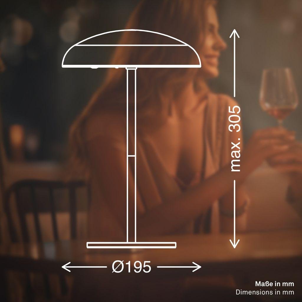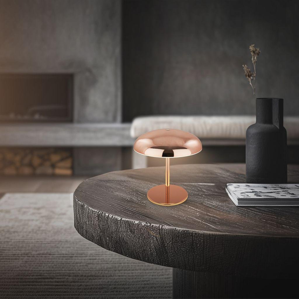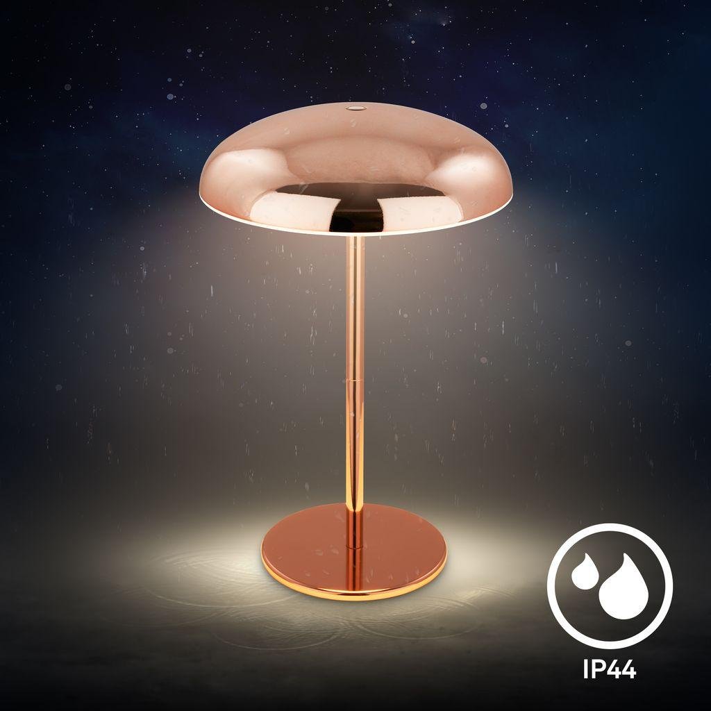 BRILONER Caxa je stylová stolní lampa s ikonickým „houbovým“ tvarem (pilzoptik), která vyniká nejen svým měděným kovovým povrchem, ale i praktickými funkcemi pro každodenní použití doma i venku. Tato bezdrátová LED lampa s výkonem 2,8 W a svítivostí 300 lm nabízí příjemné teplé bílé světlo (2 700 K), ideální pro relaxaci, čtení nebo večerní posezení na terase.
