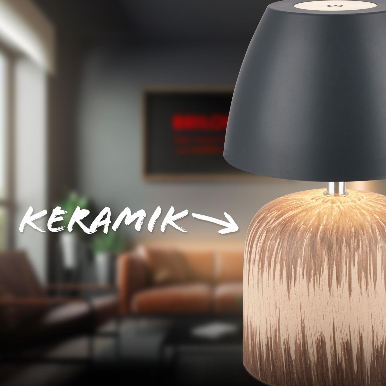 Stolní lampa BRILONER Cera v kombinaci antracitového odstínu a přírodního dekoru dřeva představuje dokonalé spojení moderního stylu a hřejivé atmosféry. Keramický základ dodává svítidlu jedinečný charakter, zatímco kompaktní rozměry (Ø13,5 x 22 cm) umožňují snadné umístění na noční stolek, pracovní desku nebo na balkon.
