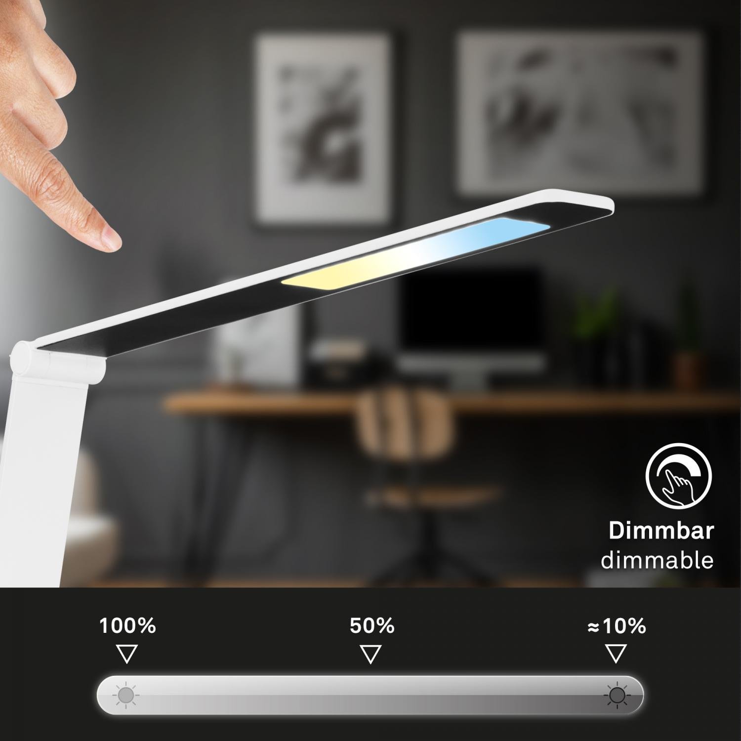 BRILONER Cuma je špičková LED lampa na psací stůl, která spojuje elegantní vzhled s chytrými technologiemi. Kombinace stmívatelného osvětlení, dotykového ovládání a bezdrátového nabíjení telefonu činí z této lampy ideálního společníka do pracovny, dětského pokoje i domácí kanceláře.