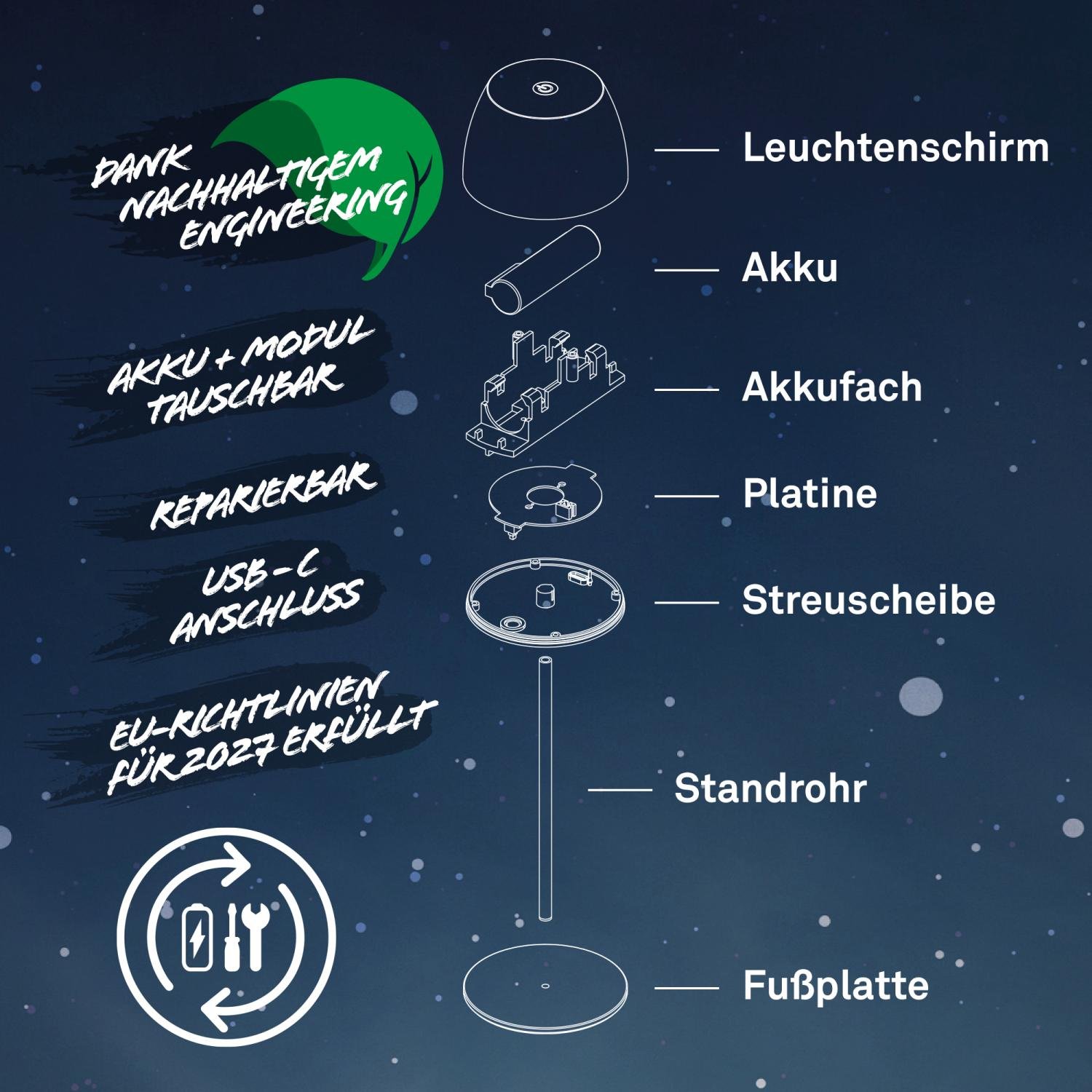 S vestavěnou Li-Ion baterií o kapacitě 1 500 mAh získáváte svobodu bezdrátového používání v interiéru i exteriéru, bez nutnosti hledat zásuvku. Nabíjení je rychlé a pohodlné přes USB-C (kabel 0,5 m je součástí balení). Díky možnosti výměny baterie a LED modulu je svítidlo maximálně udržitelné a snadné na údržbu.