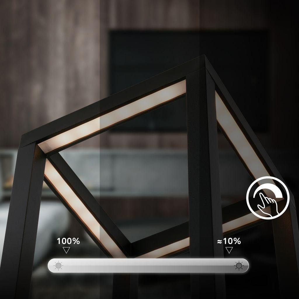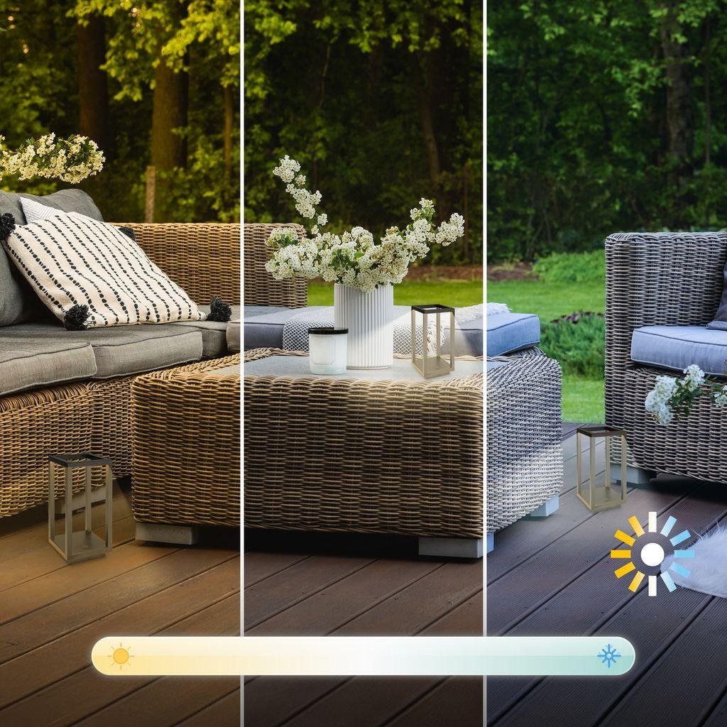 BRILONER Laer je inovativní stolní LED lampa v černém provedení, která kombinuje minimalistický lanterový design s moderními technologiemi. Díky kompaktním rozměrům 10 × 10 × 22,5 cm a odolnosti vůči vodě (IP44) je vhodná pro použití v interiéru, na terasách, balkonech i při venkovním posezení.