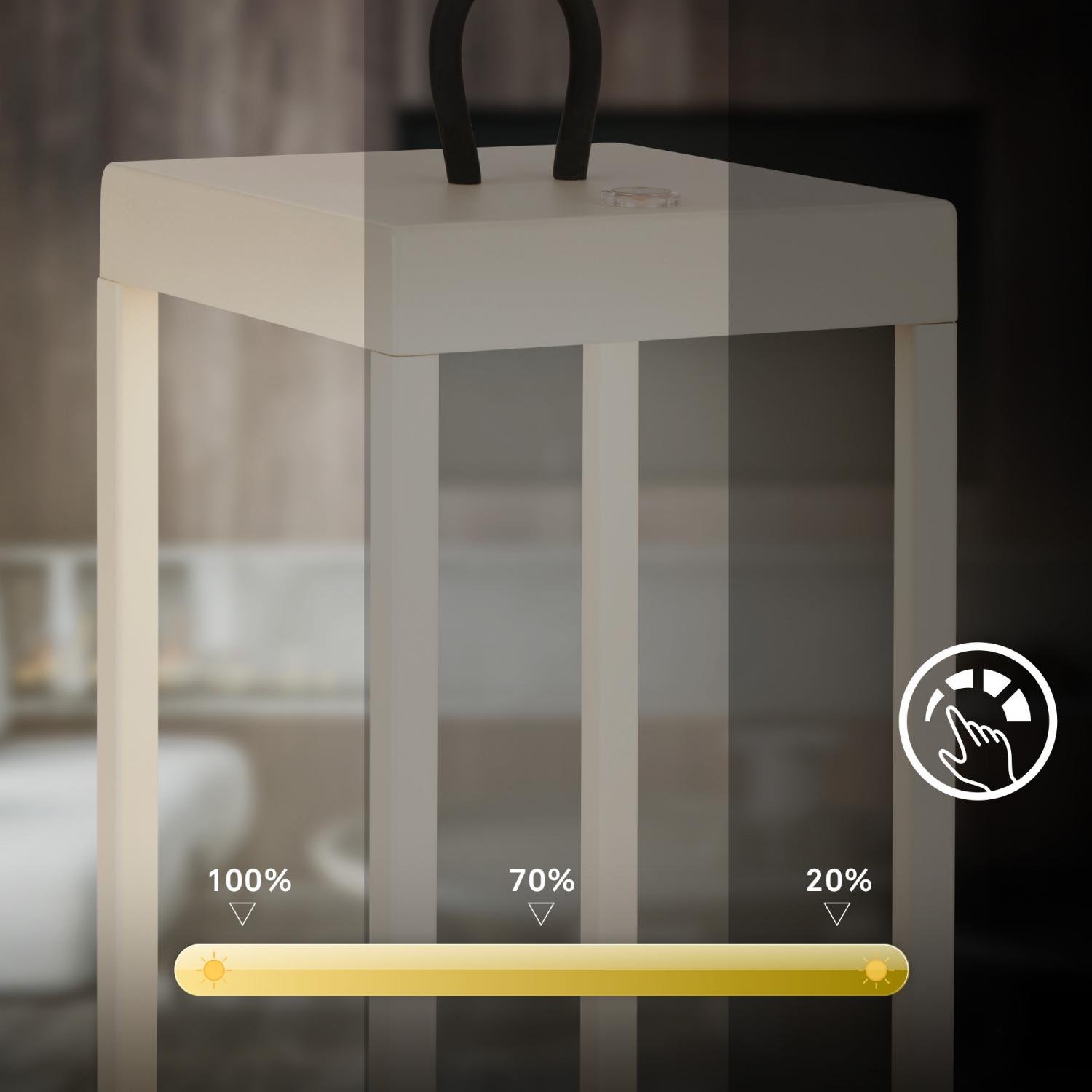 Ovládání lucerny je intuitivní díky integrovanému dotykovému spínači. Tříúrovňové stmívání (100 %, 70 %, 20 %) umožňuje nastavit intenzitu teplého bílého světla (3000K, 450 lm) přesně podle nálady, ať už chystáte večerní posezení či klidné čtení.