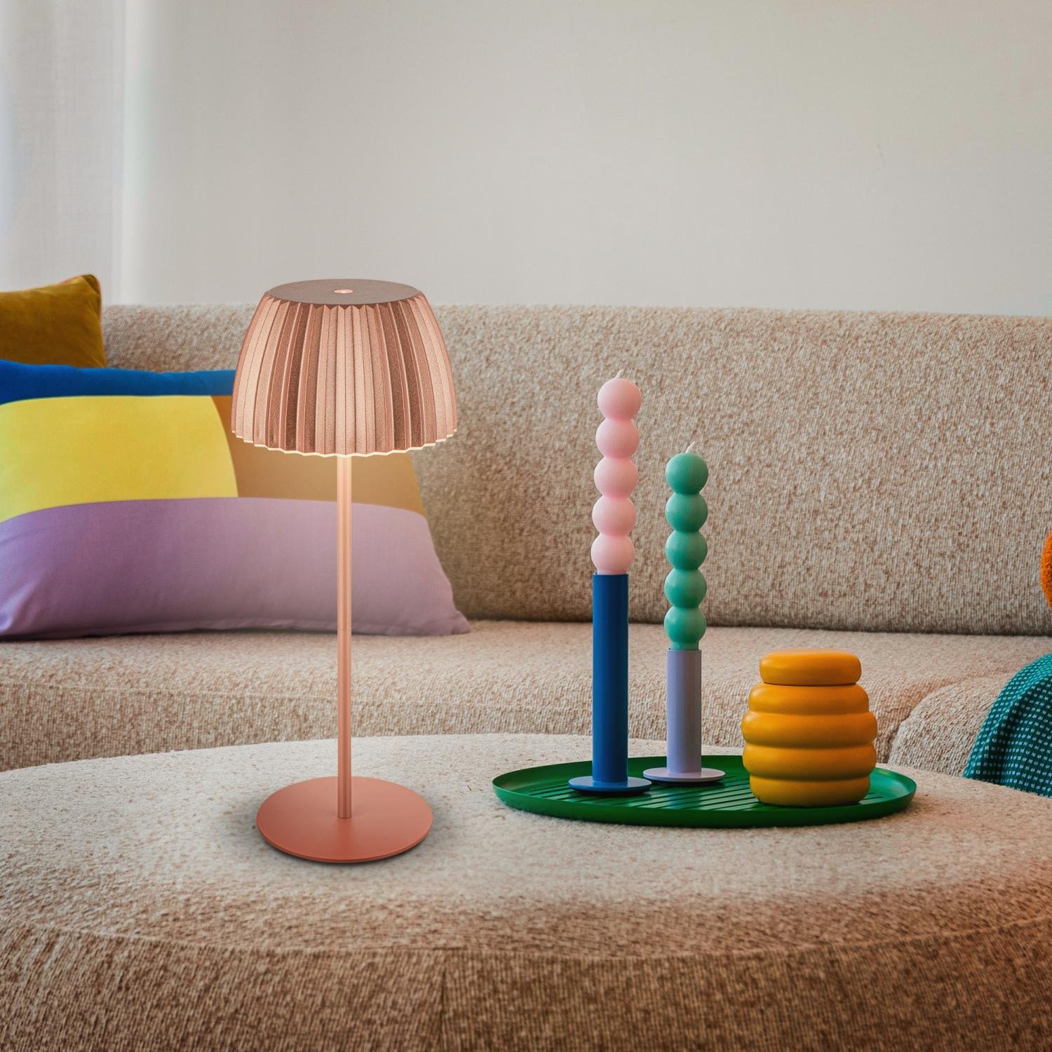 Ovládání intenzity osvětlení je plynulé díky integrovanému dotykovému stmívači. Teplé bílé světlo (2 700 K) s výkonem 2 W a světelným tokem 200 lm navodí pohodovou atmosféru při čtení, relaxaci i posezení s přáteli. Díky krytí IP44 je lampa chráněna proti stříkající vodě, a lze ji bezpečně používat i venku.