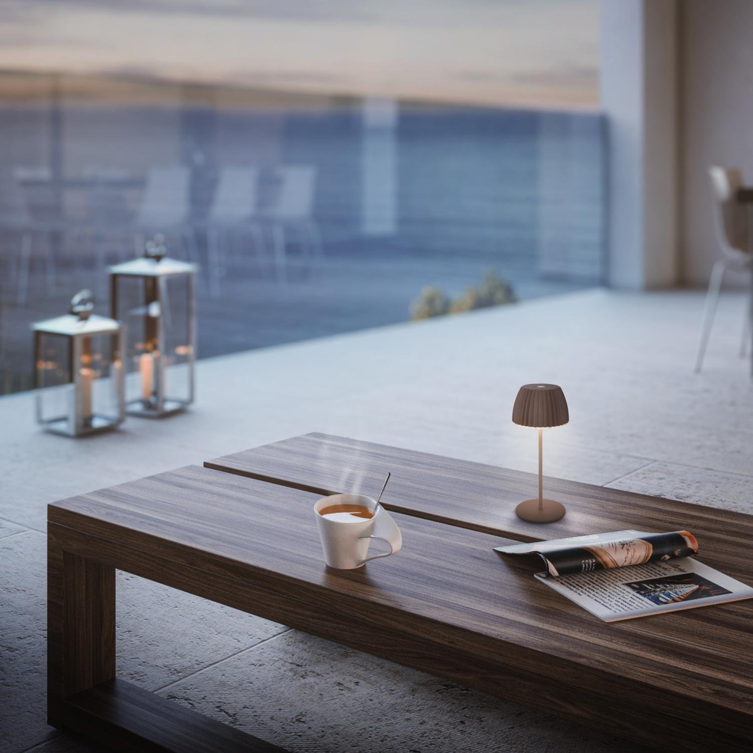 Minimalistický tvar s jemně rýhovaným stínidlem a světelnou hranou v hnědém odstínu přináší osobitý styl i do malých prostorů. Díky kompaktním rozměrům (ø 8,5 × 20 cm) se skvěle hodí na noční stolek, jídelní či konferenční stolek, ale i do zahradního posezení.