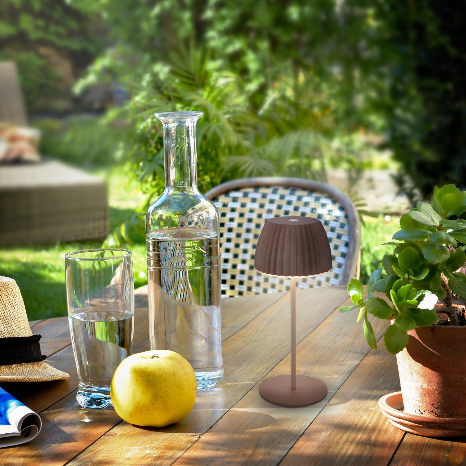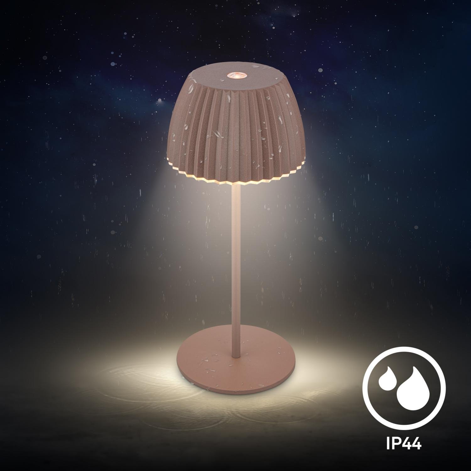 Díky integrovanému akumulátoru funguje lampa zcela bez kabelů. Je opatřena krytím IP44, které ji chrání před stříkající vodou – ideální na zahradní nebo balkonový stůl i do interiéru. Po plném nabití vydrží svítit až 24 hodin a nabíjí se pohodlně přes USB-C.
