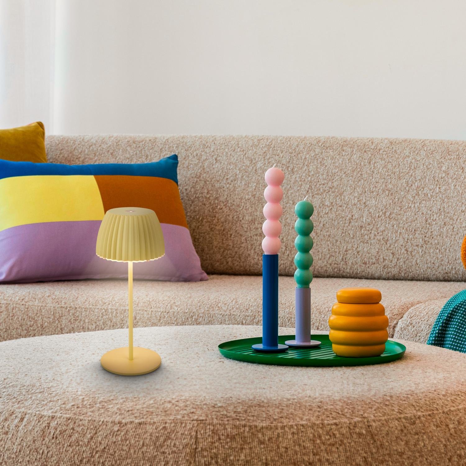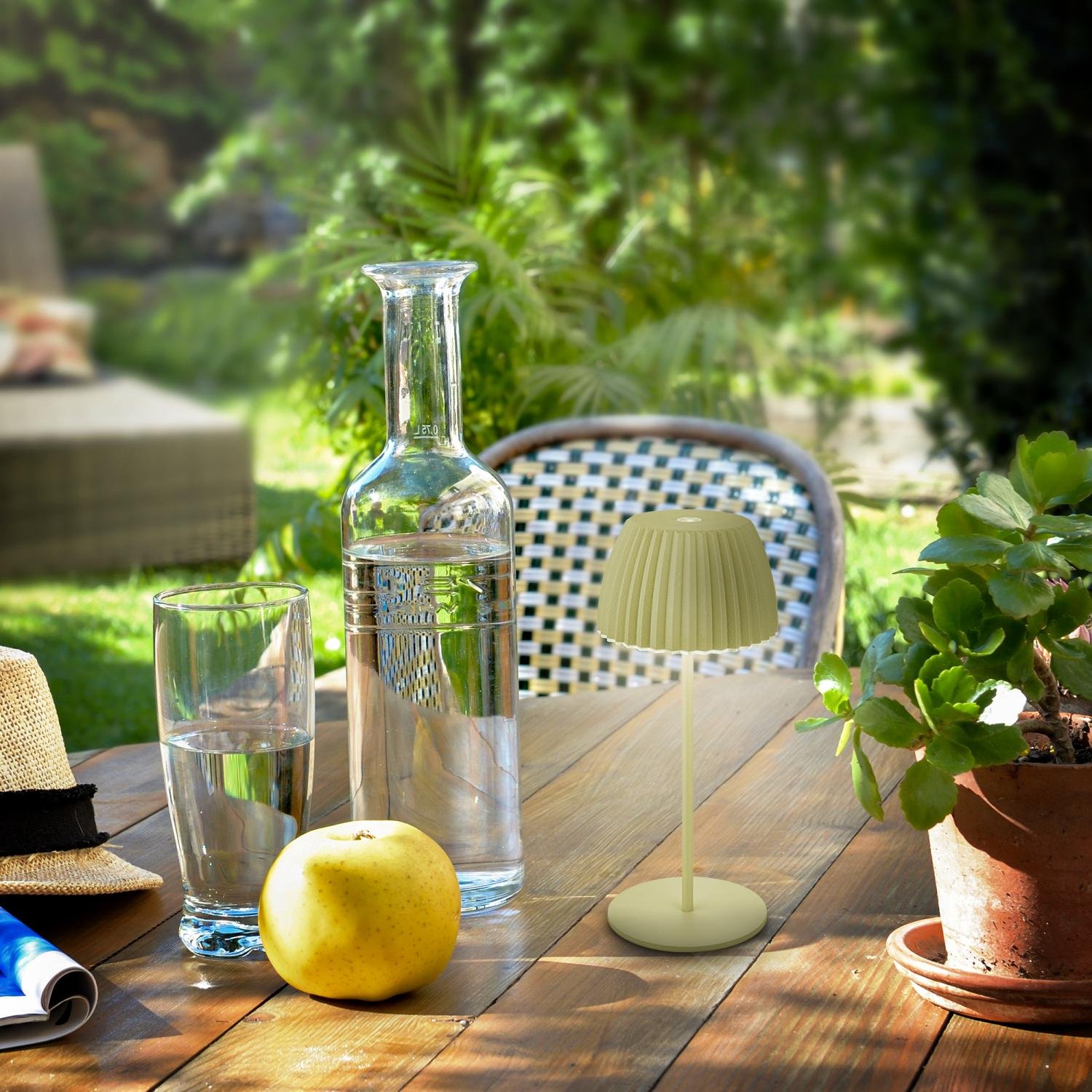 Svítidlo je vybaveno integrovaným akumulátorem s výdrží až 24 hodin na jedno nabití (doba nabíjení cca 3,5 hodiny, nabíjecí USB-C kabel v balení), což z něj činí ideální lampu pro vnitřní i venkovní použití. Stupeň krytí IP44 zajišťuje ochranu proti stříkající vodě – perfektní volba na zahradu, terasu nebo balkon.