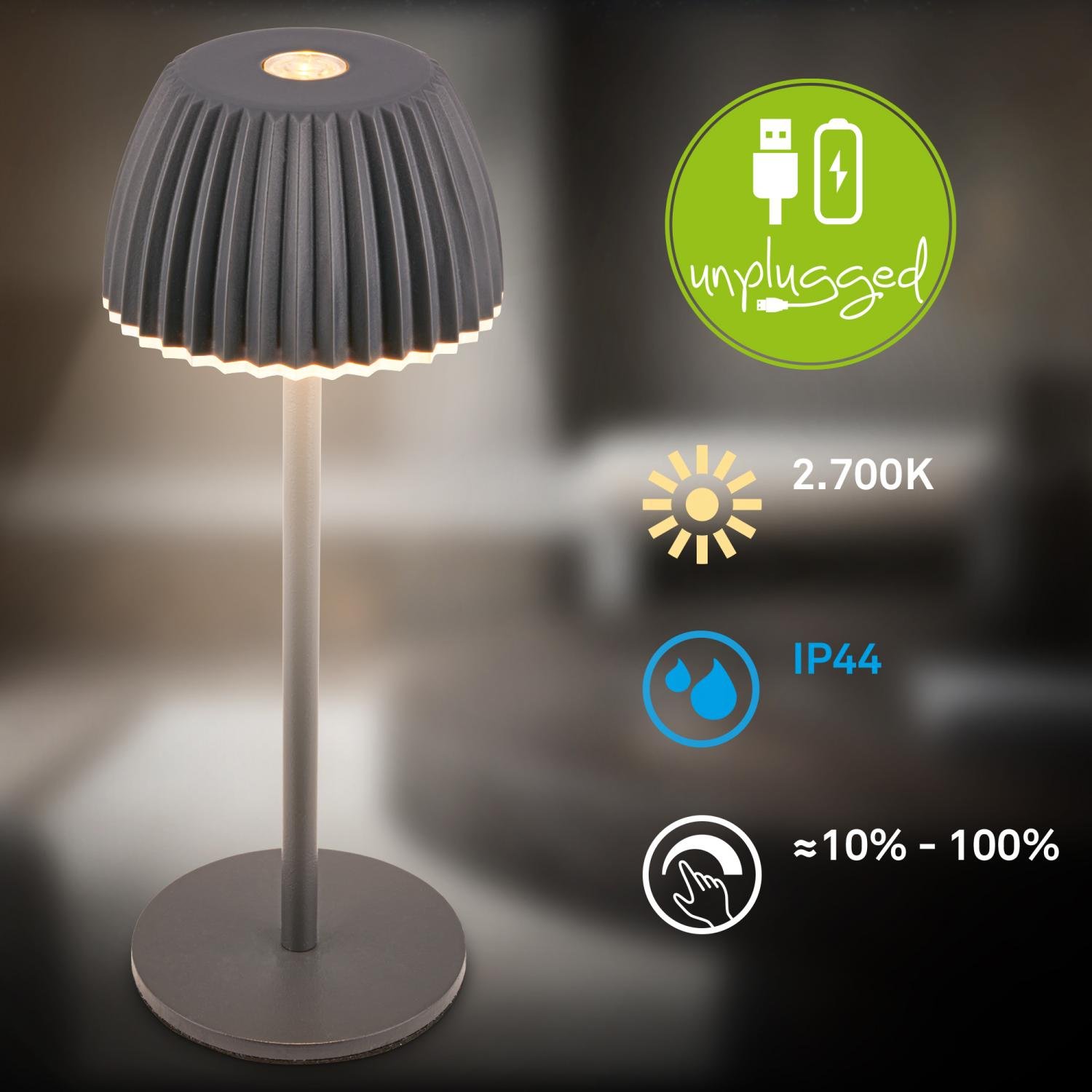 BRILONER Riffle Nano stolní lampička - 1,5W, 130lm, nabíjecí, LED, stmívatelné, dotykový vypínač, German design Award Winner 2025, antracit 7581015