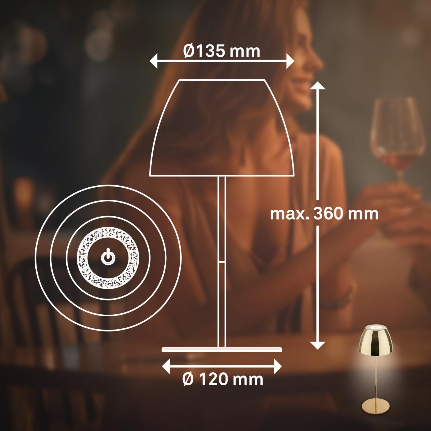 Stolní LED lampička BRILONER Serina v luxusní zlaté barvě je ideální volbou pro ty, kteří hledají kombinaci moderního designu, pohodlí a praktičnosti. Díky svému kompaktnímu rozměru (Ø13,5 x 36 cm) se skvěle hodí na pracovní stůl, noční stolek i jídelní stůl na terase. Její nadčasový vzhled povýší každý interiér i exteriér.