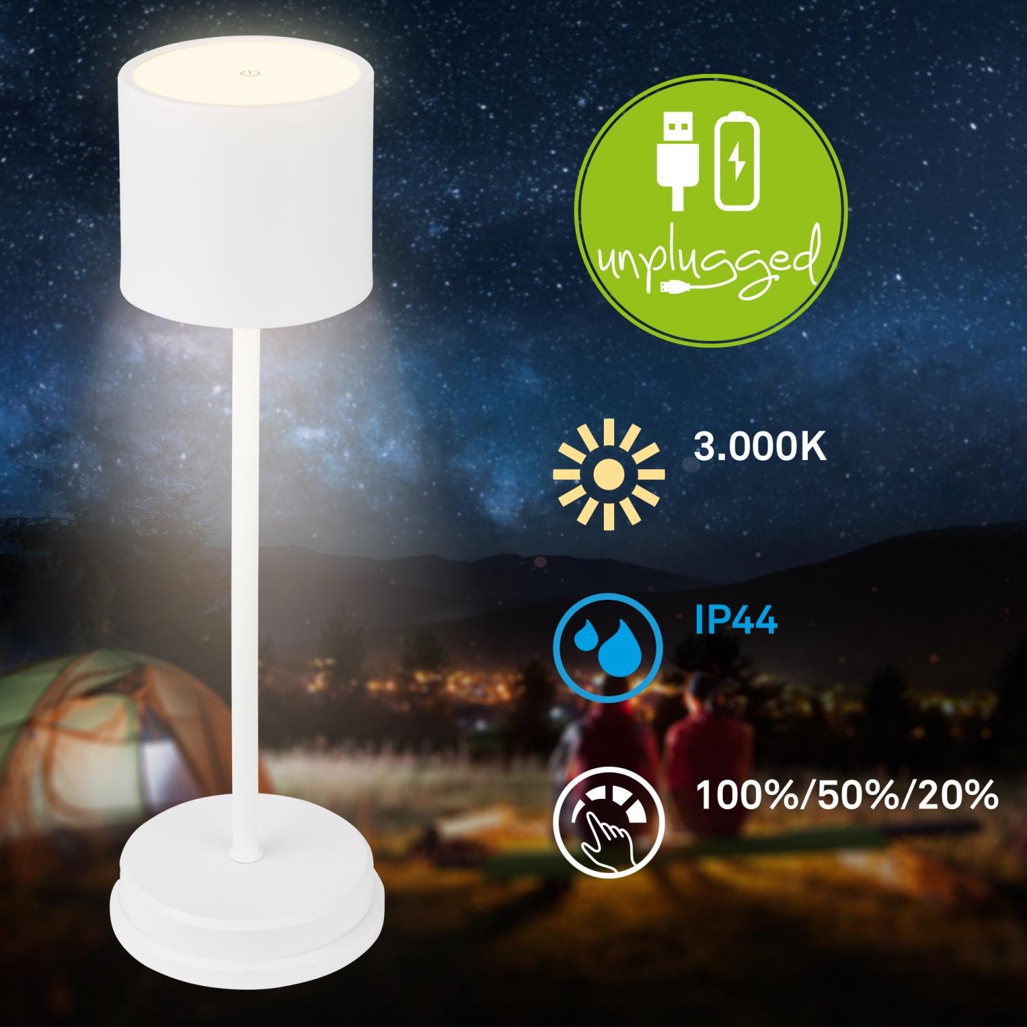 BRILONER Sigo LED stolní lampička bezdrátová IP44, stmívatelná, s nabíjecí základnou, bílá