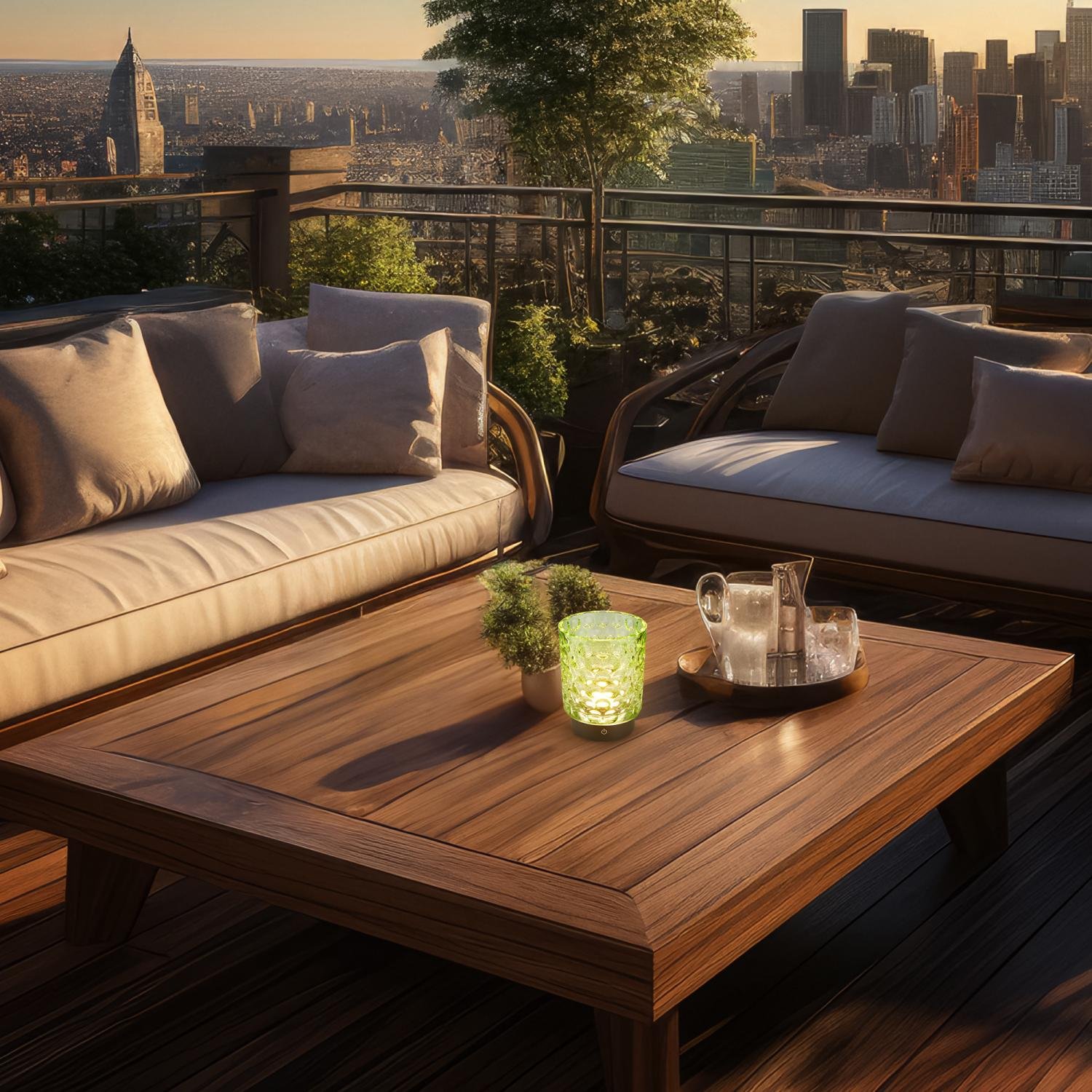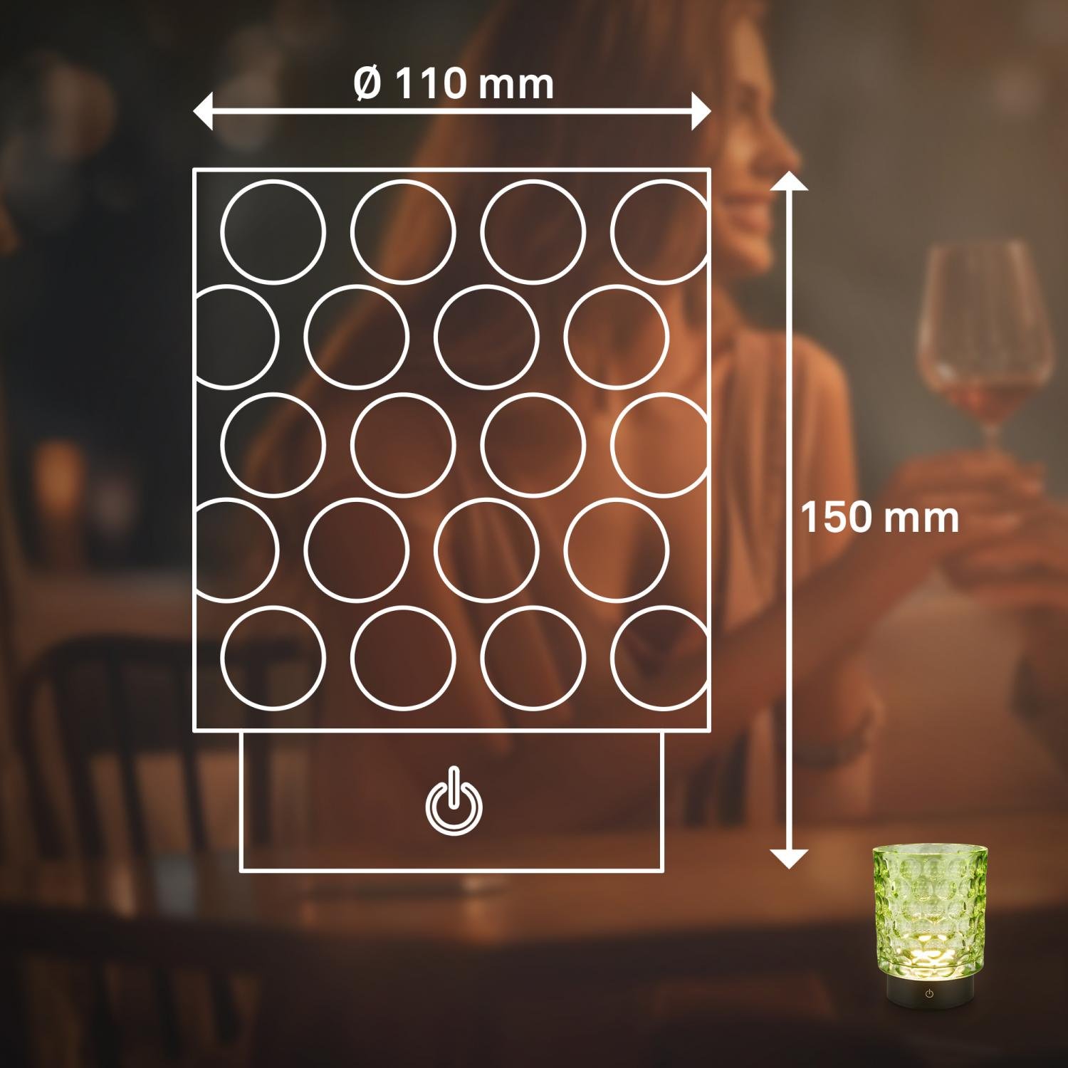 Stolní lampička BRILONER Sunora v zeleném provedení představuje elegantní spojení moderní technologie a výrazného skleněného designu. Její robustní skleněné tělo s unikátní strukturou vyniká nejen vizuálně, ale také příjemně rozptyluje světlo a vytváří útulnou atmosféru v interiéru i na terase či balkoně.