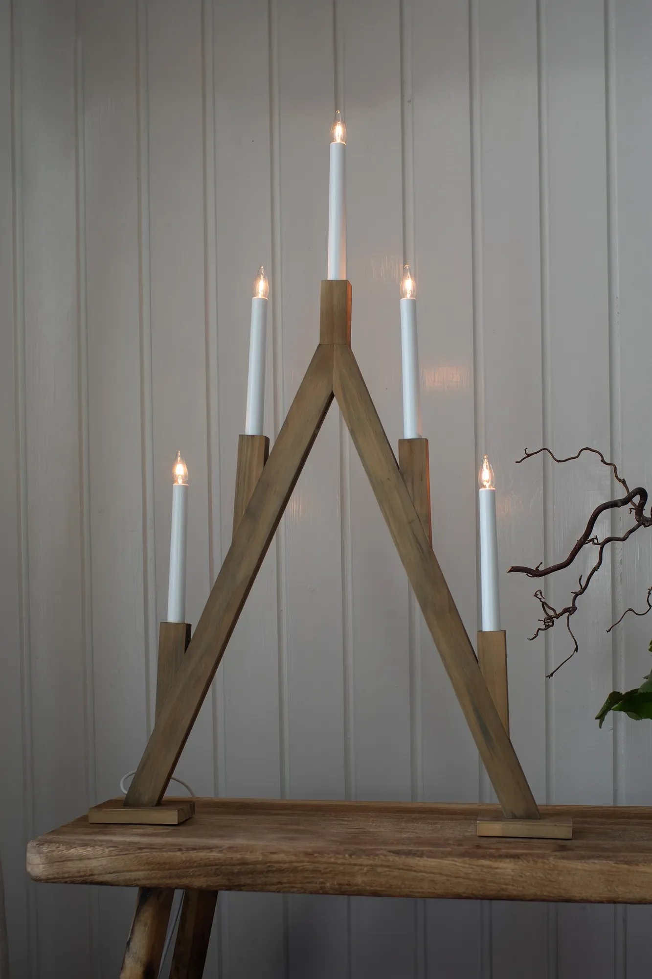 Umístěte svícen do velkého okna nebo na výrazné místo v interiéru, kde vynikne jeho symetrie a jednoduchost. Kombinujte s dalšími přírodními materiály – například lnem, vlnou nebo sklem – pro maximální pocit útulnosti a elegance. V nabídce naleznete také variantu v tmavším odstínu dřeva, kterou lze krásně sladit s tmavšími podlahami či nábytkem.