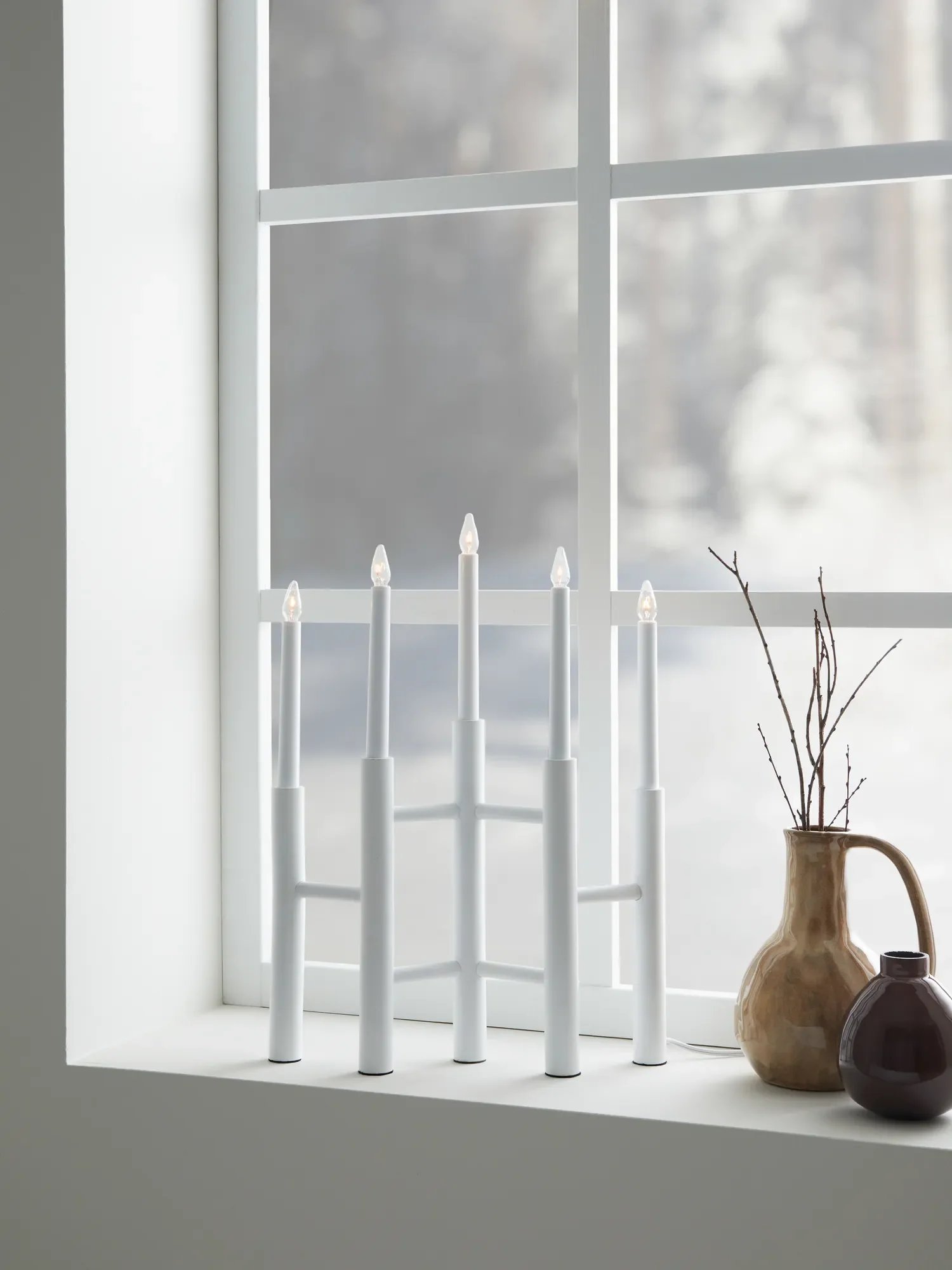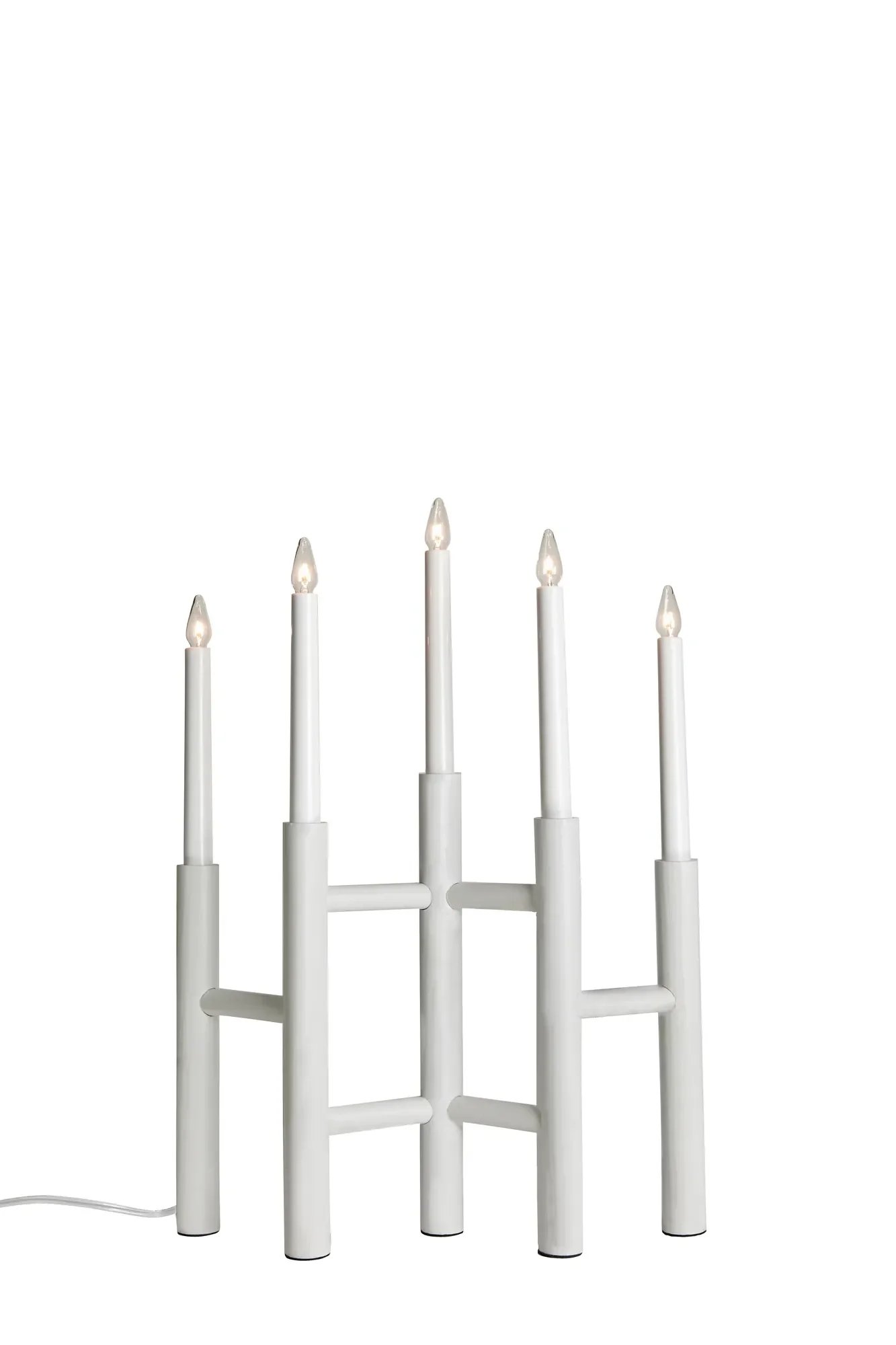 Cassiopeia od švédského výrobce Markslöjd je svícen, který zaujme svým geometrickým a zároveň vzdušným designem. Pět svíček v různých výškách je umístěno v originální cik-cak kompozici, což vytváří atraktivní světelnou scenérii a přidává interiéru hloubku i dynamiku. Elegantní bílý lak na kvalitním březovém dřevě zaručuje univerzální použití ve většině moderních i tradičních prostor.