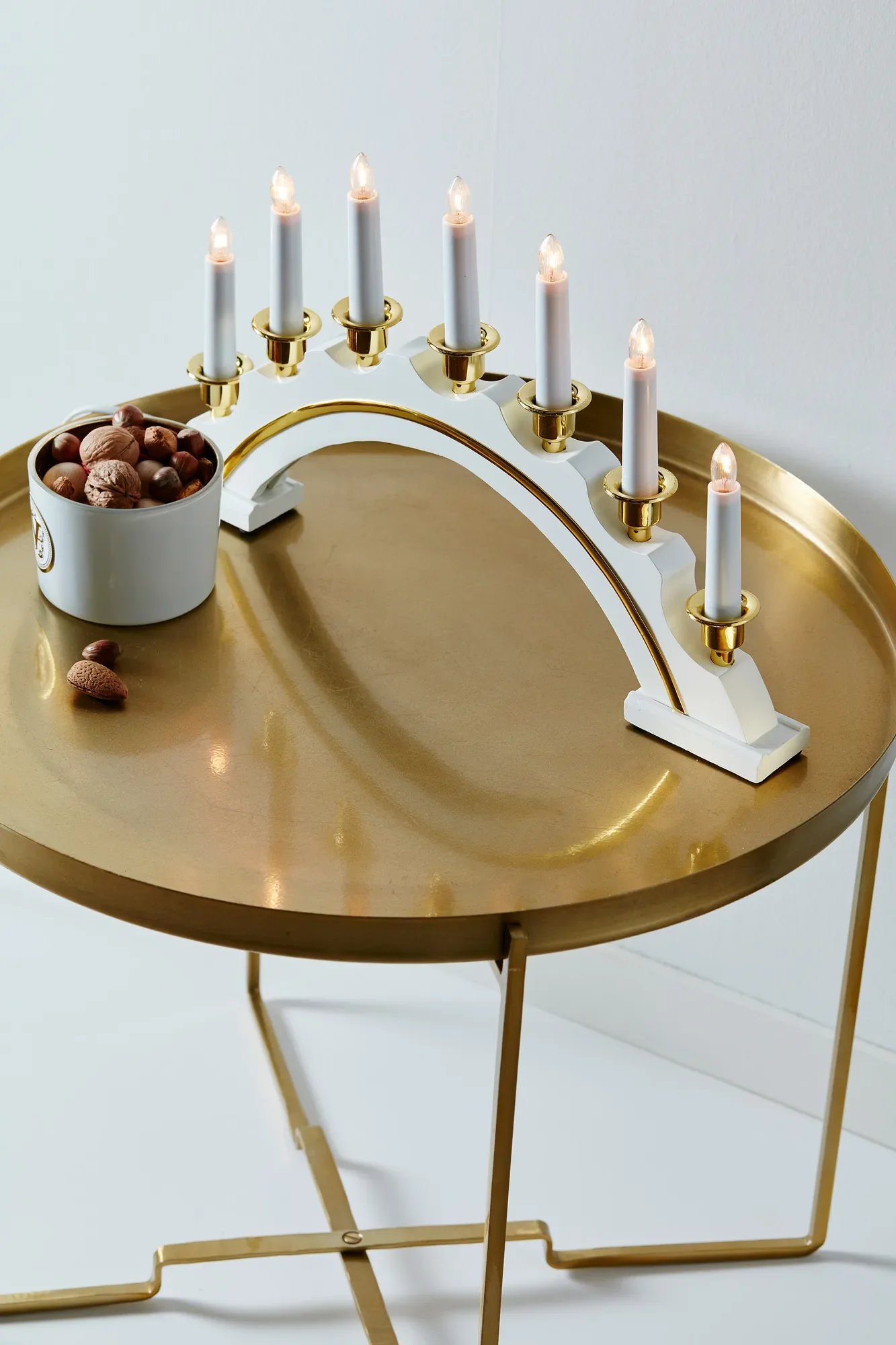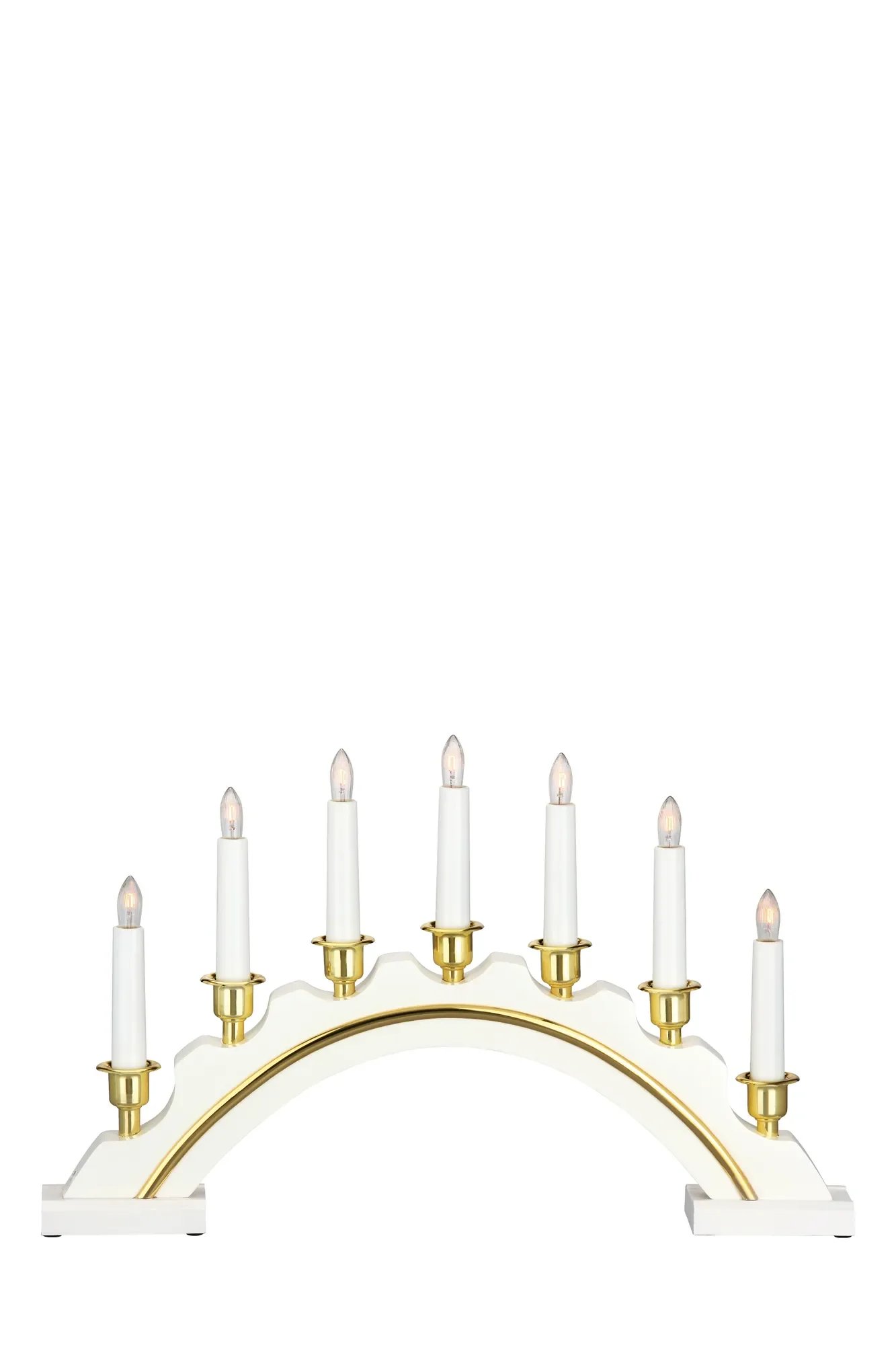 Celine od švédské značky Markslöjd je stylový sedmiramenný adventní svícen, který v sobě snoubí tradiční hodnoty se současným skandinávským designem. Jeho elegantní oblouková silueta z bíle lakovaného borovicového dřeva je doplněna mosazně zbarvenými detaily, díky nimž svícen působí slavnostně, avšak decentně. Ideální volba pro ty, kteří hledají originální, vkusné a kvalitní vánoční osvětlení nejen do moderních interiérů, ale i do tradičně laděných prostor.