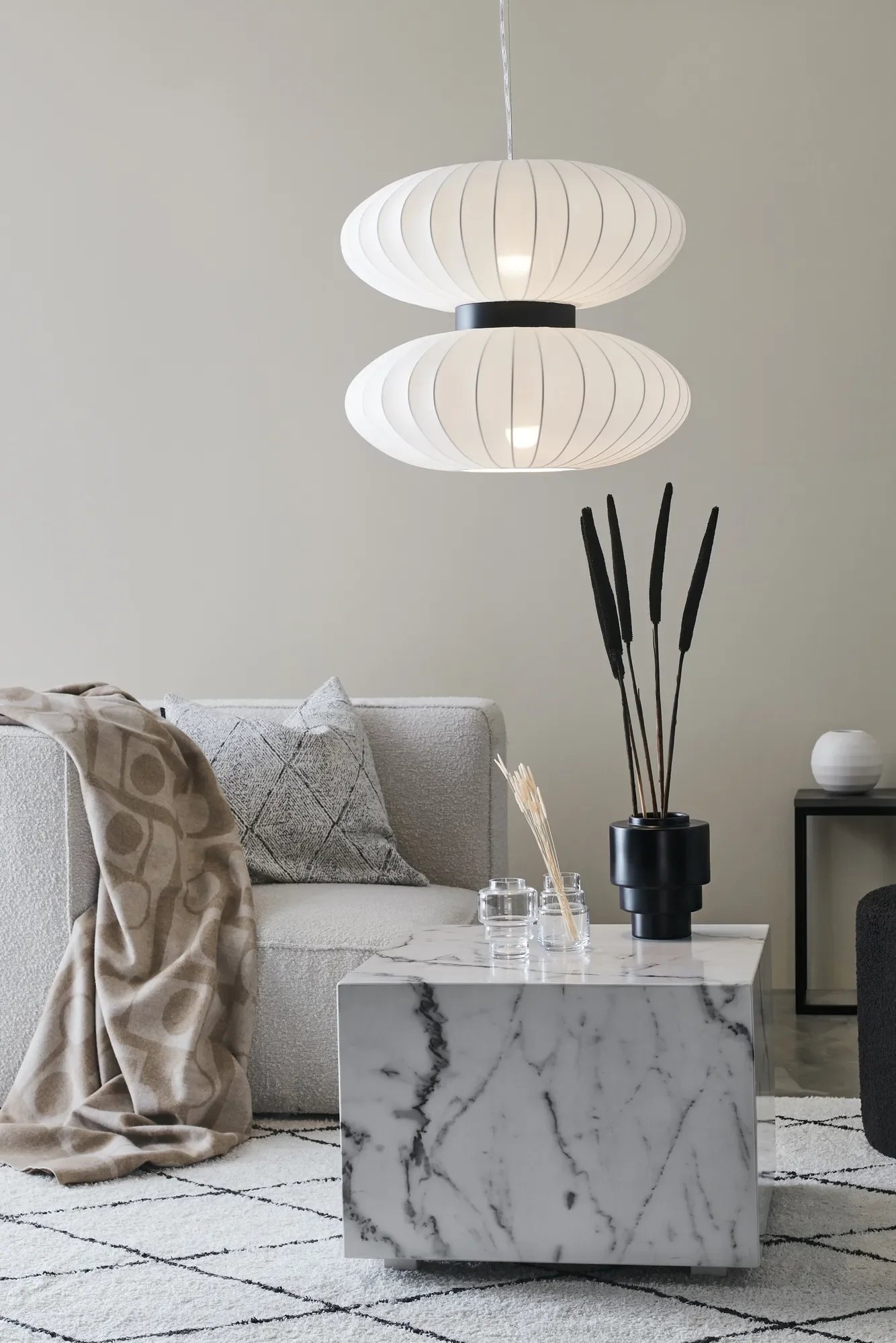 Závěsné svítidlo Markslöjd Daburu v bílé barvě představuje originální řešení osvětlení pro obývací pokoje, jídelny nebo pracovny, kde chcete spojit funkčnost s osobitým stylem. Jeho hravý tvar v kombinaci s textilním stínidlem přináší do prostoru vizuální lehkost a útulnou atmosféru. Skvěle doplní jak moderní, tak skandinávsky laděné interiéry.