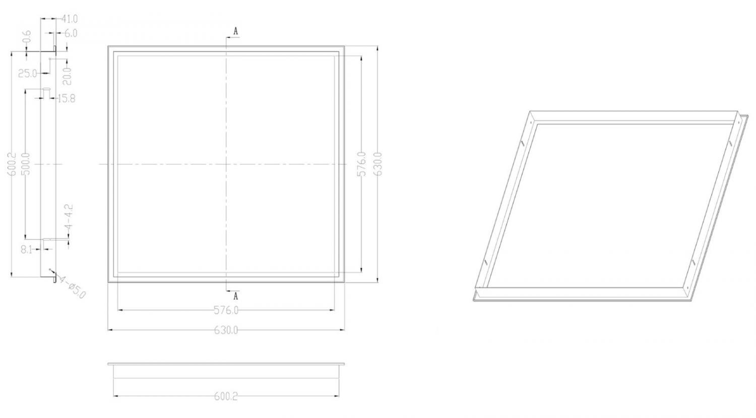 • Přesné rozměry: Vnější rozměr 630x630 mm, instalační výřez 610x610 mm. Výška rámu je 41 mm.