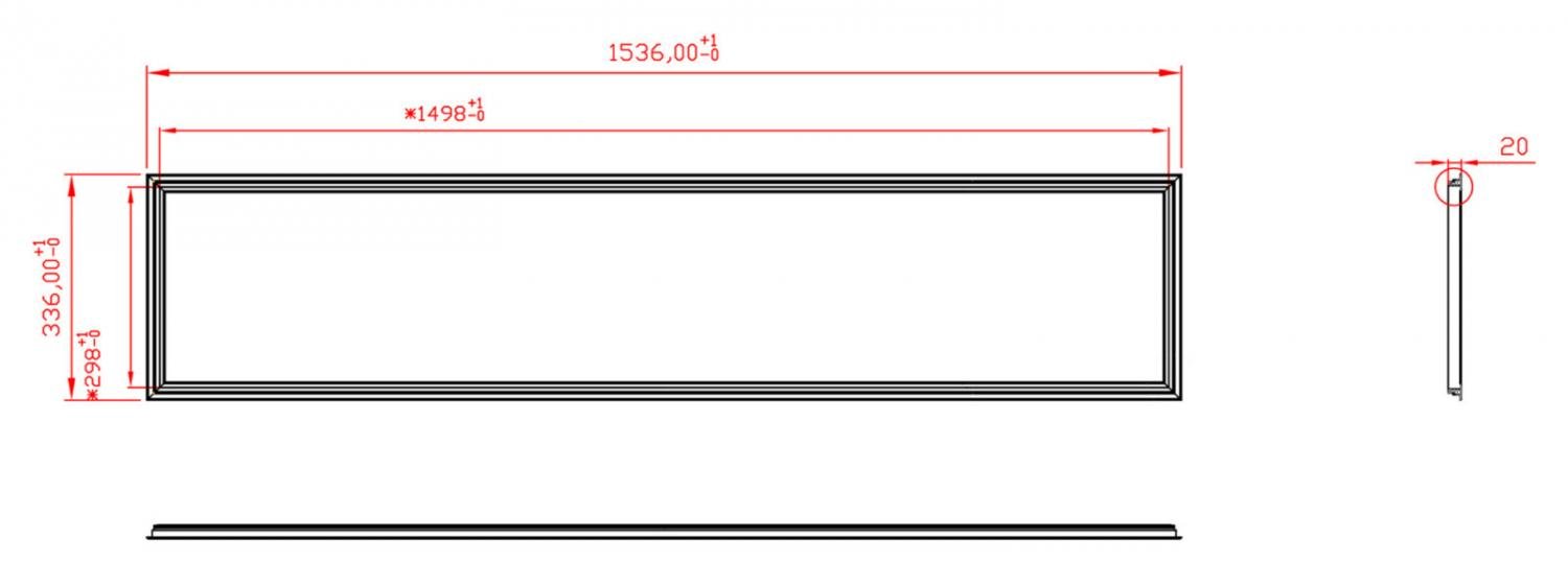 • Přesné rozměry pro snadnou instalaci: Délka rámu 1536 mm, šířka 336 mm, výška pouhých 20 mm. Rozměry výřezu: 1525 x 325 mm.