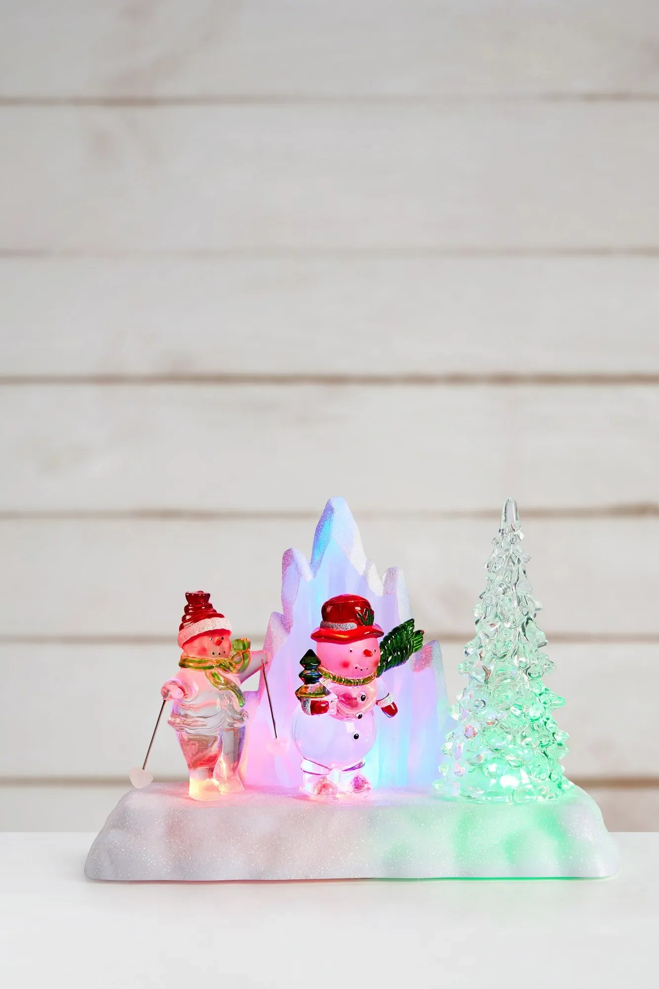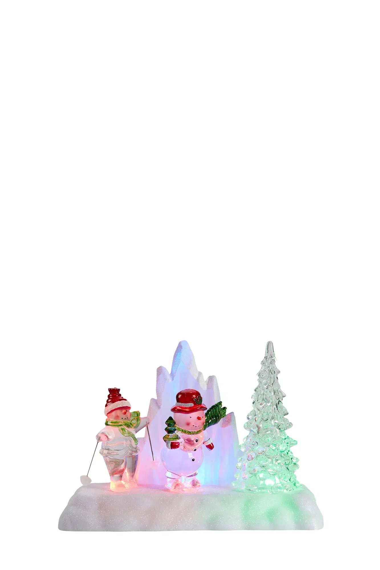 Tato hravá dekorace zaujme zpracováním zimní krajiny s transparentními sněhuláky a stromkem, které decentně rozsvěcují čtyři vícebarevné LED diody. Díky polystyrenovému provedení působí celek lehce, ale zároveň efektně, a stane se středobodem svátečně laděného interiéru.