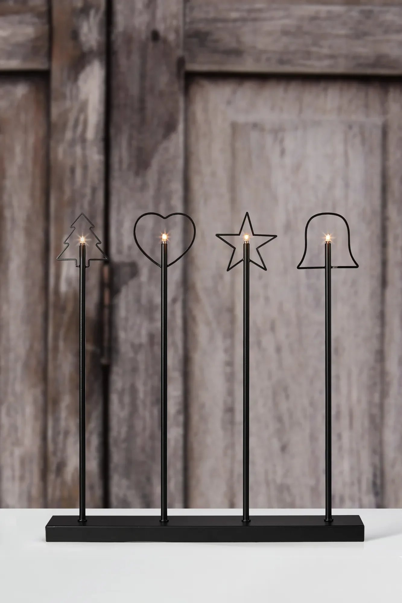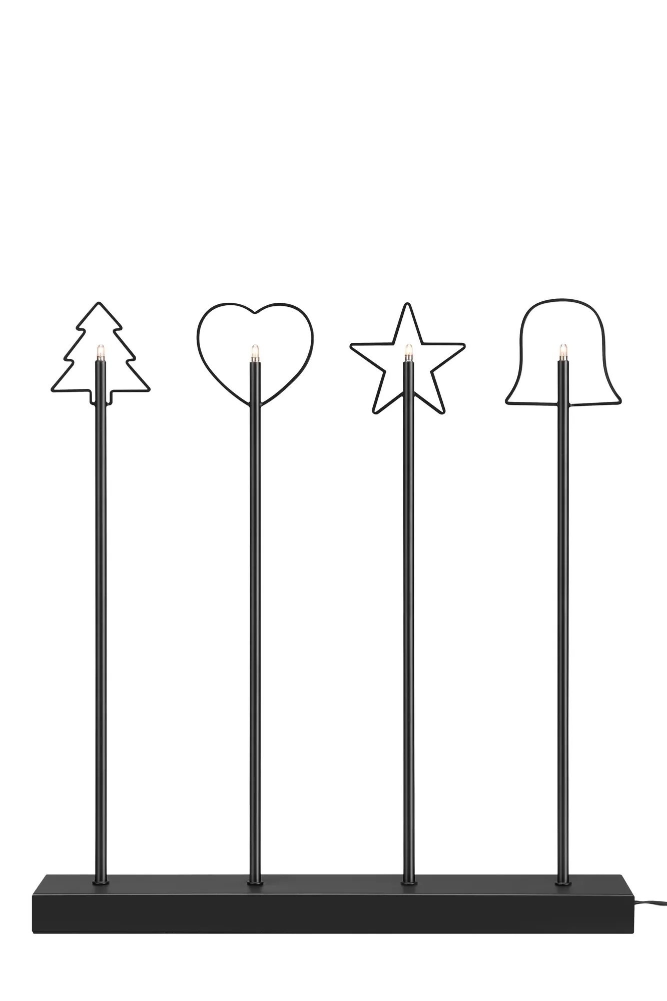 Hledáte-li svícen, který zaujme svou originalitou a čistým designem, Ginger od švédské značky Markslöjd je tou správnou volbou. Černý kovový svícen s čtyřmi subtilními světly je ozvláštněn unikátními motivy – každý světelný bod je rámován jiným symbolem Vánoc: stromeček, srdce, hvězda a zvonek. Tento elegantní prvek stylově doplní moderní i tradiční interiéry a vytvoří útulnou atmosféru nejen během svátečního období.